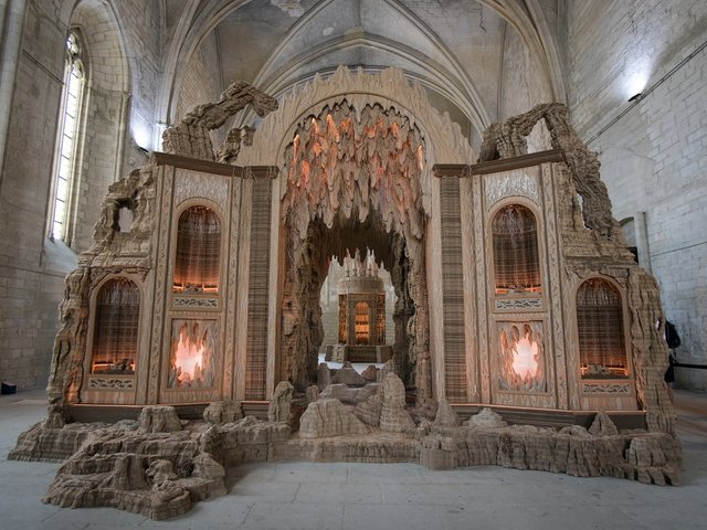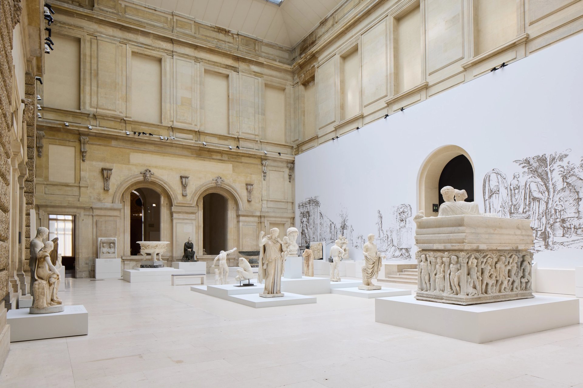 Vue de l’exposition « Chefs-d’œuvre de la Collection Torlonia » au musée du Louvre dans la cour du Sphynx. À droite :Sarcophage à colonnes figurant les travaux d’Hercule et couvercle avec couple de défunts allongés. Collection Torlonia. © Fondazione Torlonia. Photo : Agostino Osio