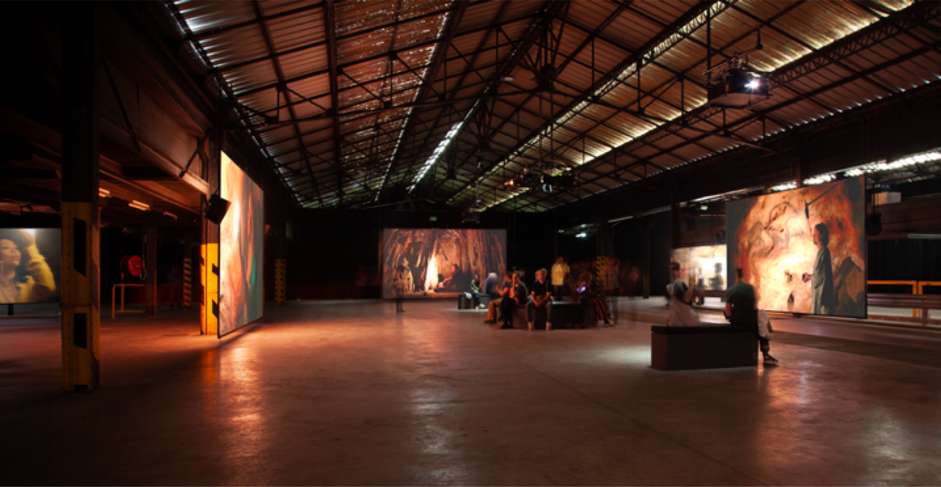 17e Biennale d’art contemporain de Lyon, Grandes Locos. Vue d’exposition avec du public. Oliver Beer, Resonance Project (The Cave), 2024.