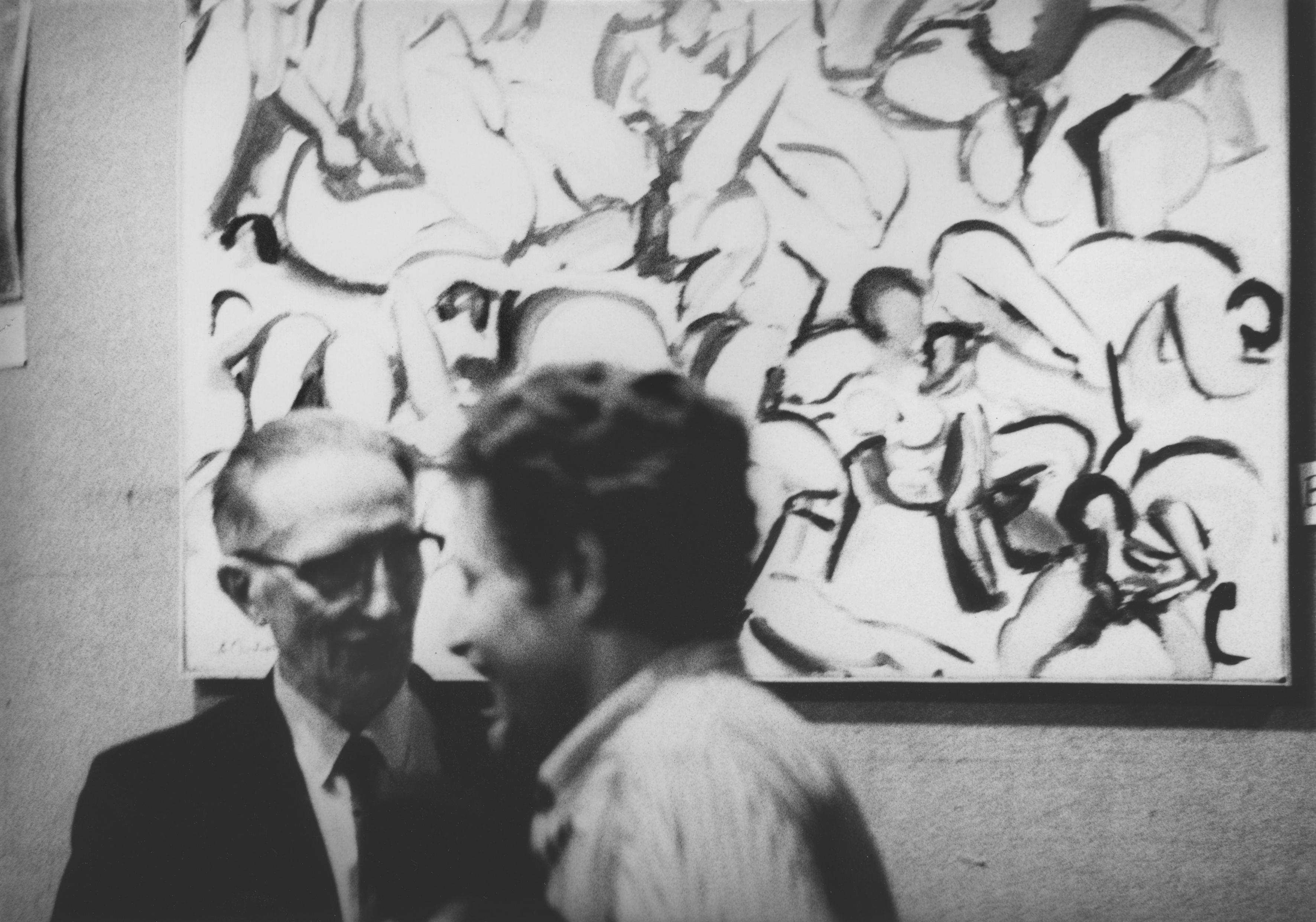 Man Ray et Marcel Duchamp assistent à la performance de Jean-Jacques Lebel, Sociodrame. Il faut qu’une porte soit ouverte ou fermée, lors de la soirée de clôture du « Workshop de la Libre Expression » au Centre américain des artistes, 261, boulevard Raspail, dans le 14e arrondissement de Paris, le 30 mai 1964. Photo : Pablo Volta