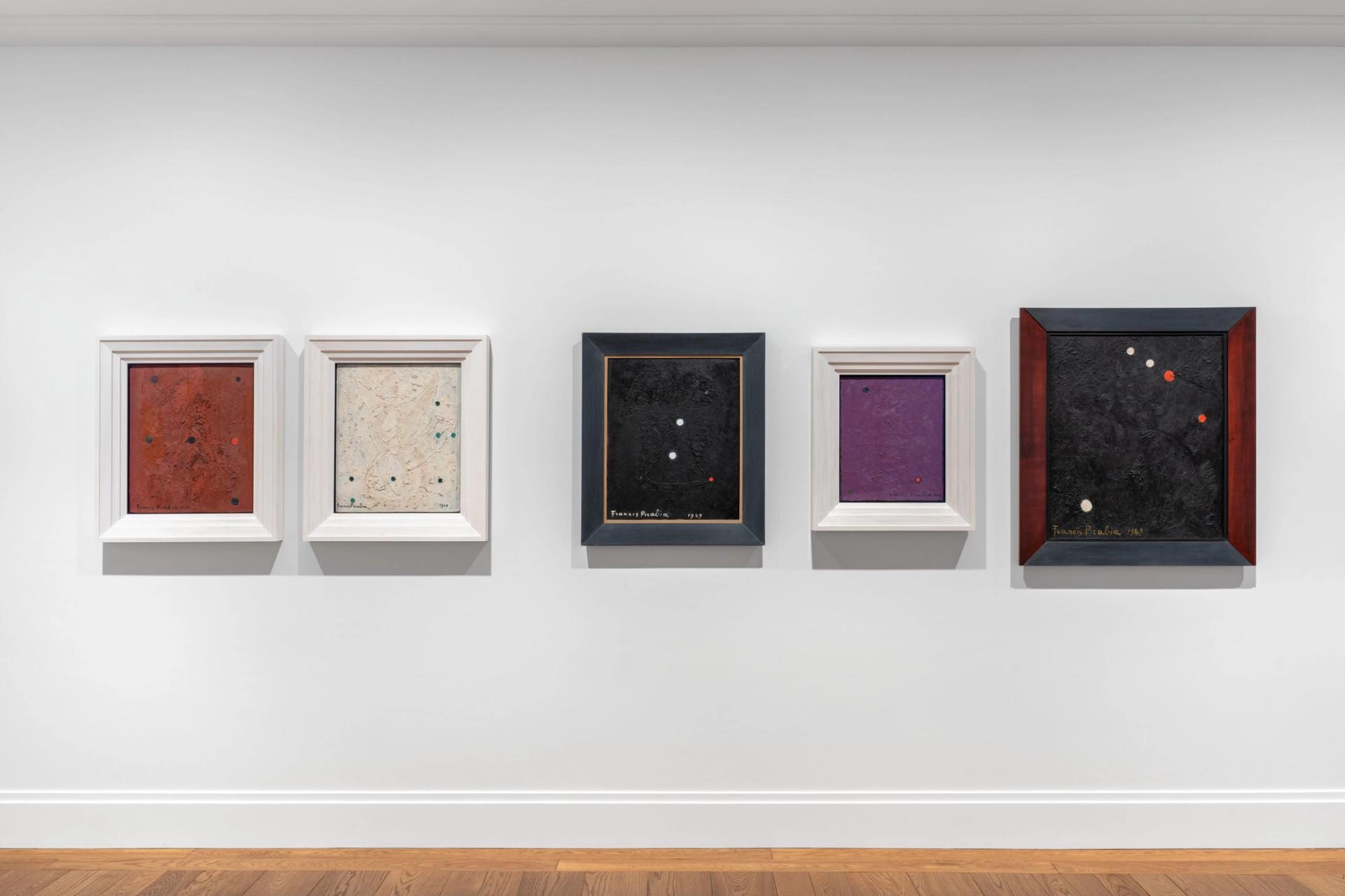 La dernière salle de l’exposition de la rue François 1er réunit un remarquable corpus de peintures « à pois » de la fin des années 1940 et du début des années 1950, un ensemble éclectique qui montre que l’artiste n’a rien perdu de sa liberté et de son inventivité. Datant de ses dernières années, l’une de ces toiles, pratiquement ton sur ton, présentant huit pois légèrement en relief, porte un titre en tout point évocateur : Et qu’est-ce qui me plaît ? Ce que j’aime peindre !