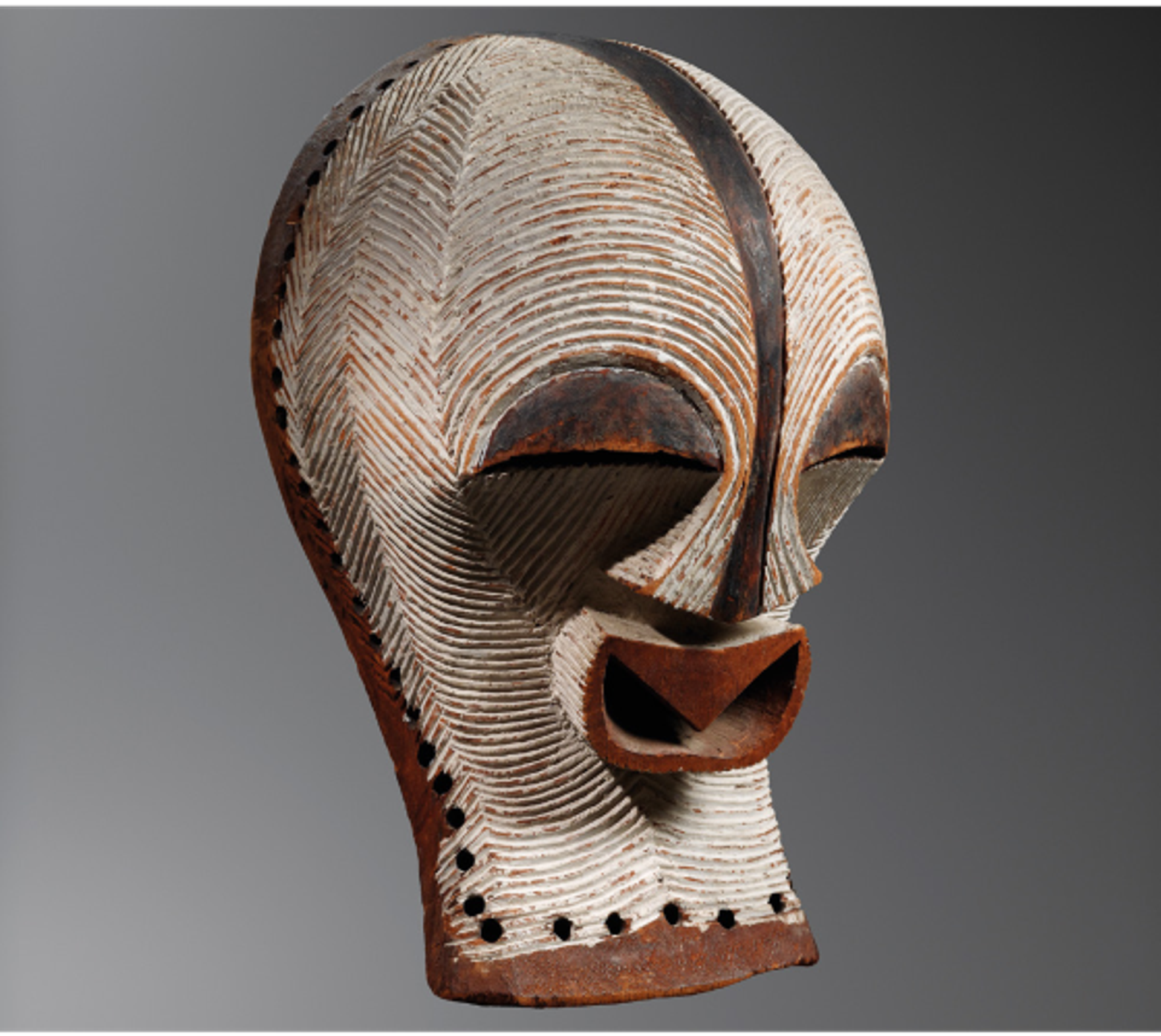 Féru d’arts africains, Didier Claes présentera notamment un masque songye découvert en 1934 à Katanga (Congo). Réalisé entre la fin du XIXe et le début du XXe siècle en bois et pigments, cet objet fait partie de l’art des fétiches nkisi ou nkishi du peuple songye, qui leur assuraient richesse, fécondité et succès. Il s’agit d’un masque féminin comme le révèlent le blanc et le noir, l’absence de crête sagittale et le nez épaté. Ce masque rituel, appelé « bifwebe bakashi », était sorti lors des cérémonies funéraires, de l’investiture d’un chef ou encore des rites lunaires. Il sera montré aux côtés d’un rare exemple d’étrier de poulie en bois et métal, provenant du peuple gouro, en Côte d’Ivoire, et probablement façonné par le « Maître de Bouaflé », actif entre 1880 et 1930.