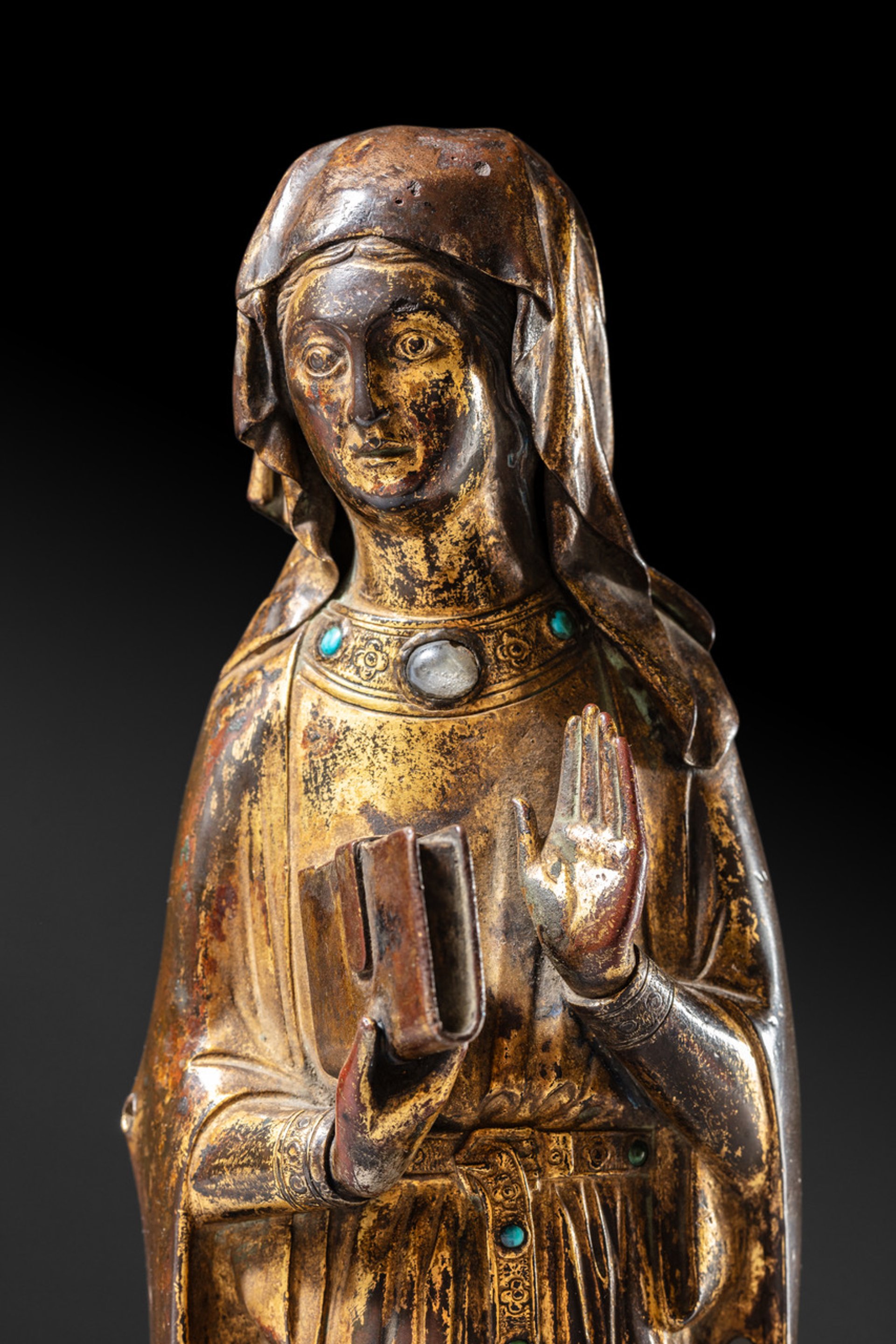 Grande Vierge de l'Annonciation en cuivre repoussé, gravé et doré, petits cabochons de turquoise (deux en verre) et cristal de roche, Haute Epoque, vers 1220-1250. Courtesy Giquello