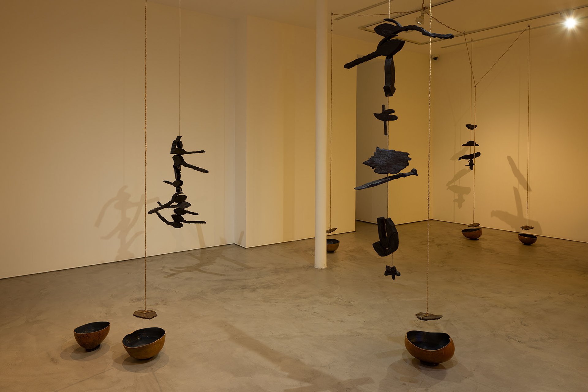 Minia Biabiany ne craint pas de s’affirmer artiste et pédagogue. Sa façon d’aborder les questions postcoloniales et environnementales prend forme à partir d’investigations tant esthétiques que scientifiques, et superpose à un imaginaire collectif le sien propre. « Le Ciel aux yeux racines » est construit à partir d’une constellation inventée par elle, mais qui s’inspire de la vision astronomique des Kali’nas. Sur la carte du ciel de la Guadeloupe au moment de l’exposition, elle a dessiné une figure de grenouille pour relier des étoiles entre elles. Les étoiles qui ont servi à former cette constellation imaginaire ont inspiré des céramiques et celles-ci ont été suspendues par des cordes tressées en différents points de la galerie et au-dessus de calebasses remplies d’eau. Les cordes sont faites de feuilles de bananier et ont été tressées selon une méthode traditionnelle par des proches de l’artiste. La grenouille céleste dessine un parcours et les cordages font le lien avec la réalité quotidienne de la Guadeloupe. D’autres suspensions parsèment le parcours. Ce sont des enfilades de formes en bois brûlé représentant des figures animales ou des formes végétales caractéristiques de l’île. La fleur de bananier est l’élément dominant. Celle-ci permet d’évoquer le scandale de la chlordécone (ce pesticide qui a durablement contaminé la Guadeloupe et la Martinique), mais elle est aussi dotée de vertus curatrices et fonctionne comme une image rassembleuse. Minia Biabiany travaille sur ces différents niveaux de signification en accordant une importance primordiale au tressage pour ce qu’il porte de tradition et de puissance métaphorique. Au sous-sol est projeté un bref film sensuel et poétique, alternant vues d’océan et tracés de dessins sur ardoise. Des phrases défilent sur l’écran. On en relève une : « je prends la forme des émotions ».