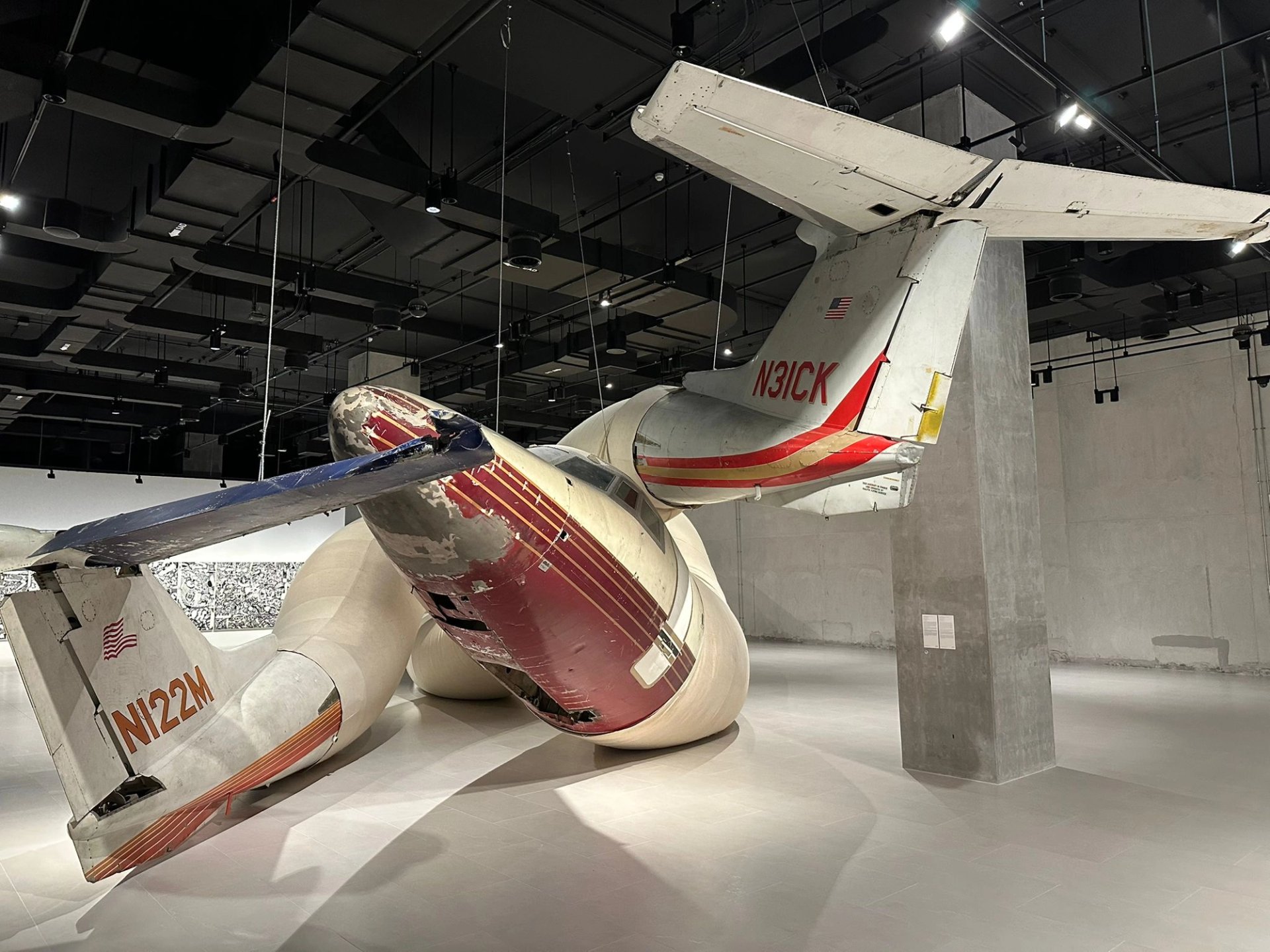 Au sous-sol du QSNCC (Queen Sirikit National Convention Center), un imposant centre des congrès de Bangkok, nouveau lieu pour la Biennale, Adel Abdessemed associe dans cette œuvre imposante de 2008 trois carcasses d’avion, enroulés comme des serpents. Il y fait aussi référence à la figure maternelle et nourricière, les plis de l’avion évoquant un gâteau qu’elle réalisait.