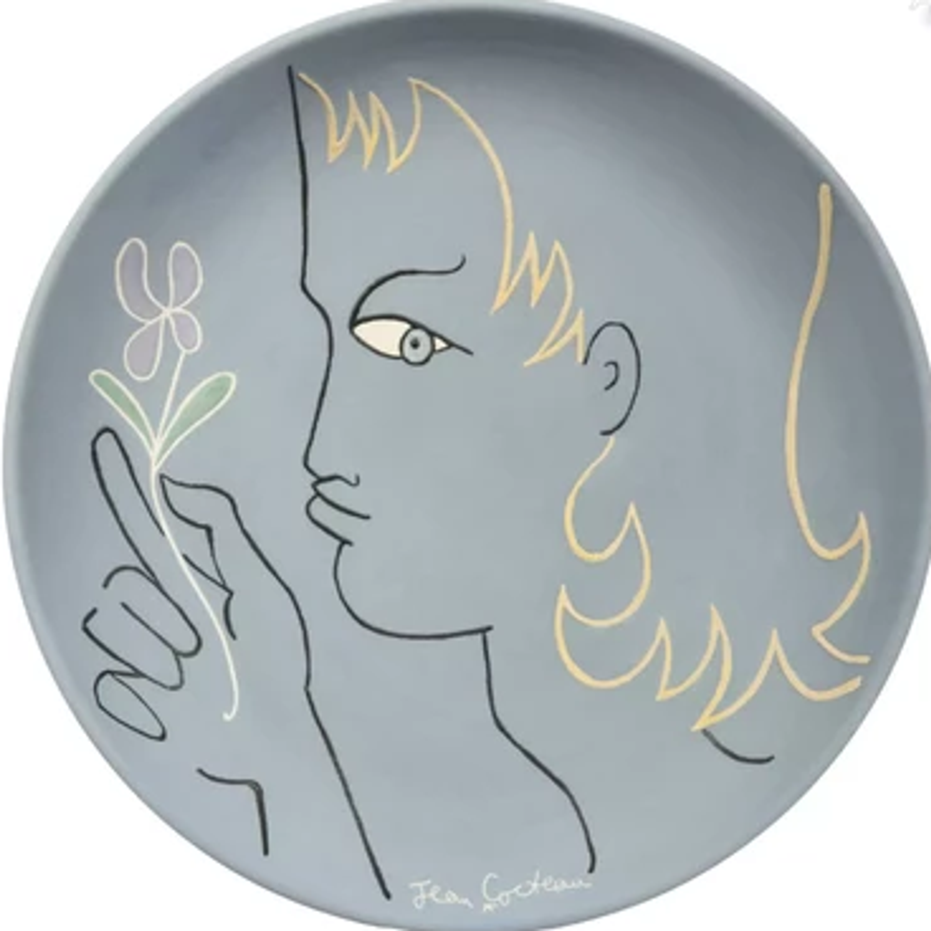 Jean Cocteau, L’ingénue, 1963, coupe en terre de faïence blanche, engobes noir, gris-bleu et jaune d’or, crayon d’oxyde mauve, turquoise et jaune. Courtesy Millon