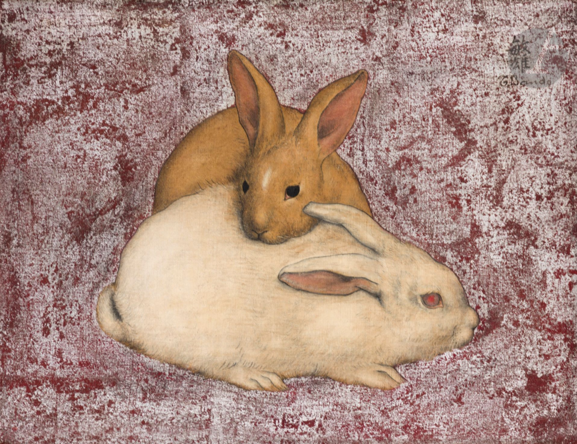 Toshio Bando, Les Deux lapins, 1925n huile et feuille d'argent sur toile et encre, 27 x 35 cm. Courtesy Ader