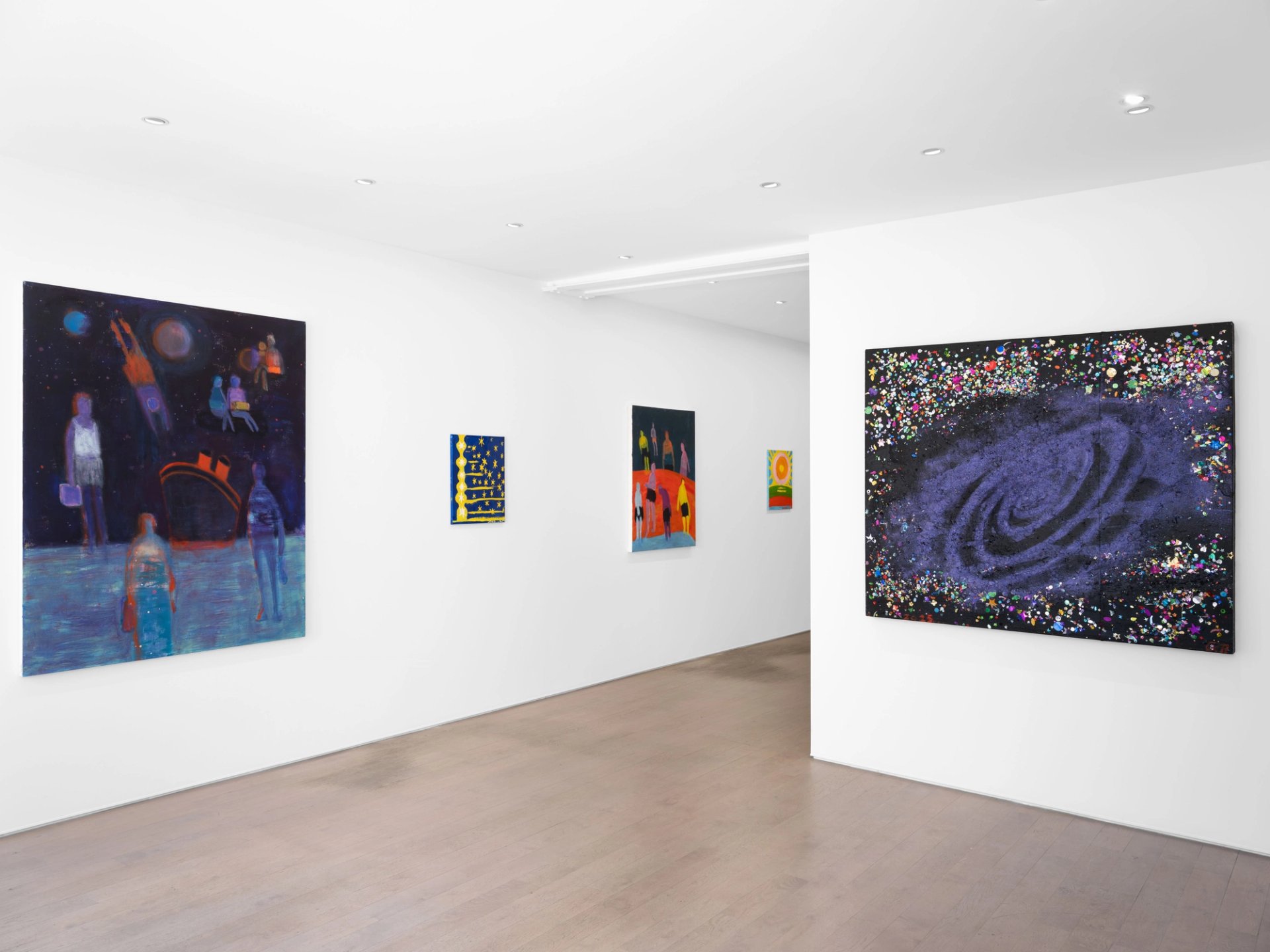 Katherine Bradford et Chris Martin sont amis et s’admirent depuis les années 1980, alors qu’ils occupaient chacun un atelier dans le quartier de Williamsburg, à Brooklyn. C’est la première fois qu’ils exposent ensemble, mais la sélection des œuvres et les choix d’accrochage font que leur entente saute aux yeux. Avec un accent particulier mis pour elle sur ses nageurs et, pour lui, sur ses paysages cosmiques, le titre « Saturn Swimmers » scelle une réunion dominée par la joie plutôt que par la mélancolie. Qu’elles soient rassemblées autour d’une piscine ou qu’elles tournent tels des satellites autour d’un paquebot, les figures de Katherine Bradford s’élèvent toujours au-dessus de la réalité. Une piscine est chez elle un tableau dans le tableau et une ouverture vers l’infini. Chris Martin voue depuis toujours un culte au peintre californien Alfred Jensen et à quelques prépsychédéliques de l’art. Il peint de façon insatiable, variant les styles, célébrant l’astre solaire ou le mouvement des planètes auquel se joint parfois un disque de vinyle culte. Les deux peintres qu’unit un sens de la communauté, mettent en évidence des points de passage entre leurs créations. Cette réunion d’œuvres fait une riche parade où les baigneurs grimpent au ciel et des manchots revisitent la Highway 61.