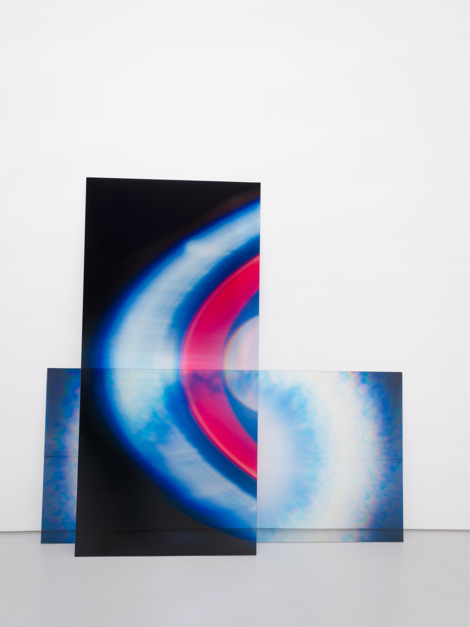 Depuis septembre 2024 et jusqu’à mai prochain, Angelica Mesiti présente à la Art Gallery of New South Wales, à Sydney (Australie), The Rites of When. Il s’agit d’une installation immersive qui diffuse sur sept grands écrans verticaux un film d’une trentaine de minutes. Ce dernier s’articule en deux mouvements correspondants aux deux solstices, un voyage initié à partir des pléiades qui nous fait traverser la terre et s’achève par la vision de champs de blé en feu. Les scènes de nature sont entrecoupées de rites et de danses rituelles. À partir de stills pris au début et au milieu du film, Angelica Mesiti a fait réaliser des impressions sur verre qui font la matière d’« Acoustic Light ». Les plaques de verre, au sol ou sur des barres d’acier en hauteur, sont superposées et appuyées par deux ou trois contre le mur. Les différences de formats entre les plaques, ou simplement leur décalage, créent des effets de mouvement et des variations de lumière. Les cercles bleus ou rouges qui entourent un noyau de lumière nous rappellent tout un courant spirituel qui irrigue l’abstraction depuis Hilma af Klint jusqu’aux films de Jordan Belson ou de James Whitney. Mais, ce noyau de lumière est aussi le double du projecteur de cinéma et la superposition de ces plaques photographiques joue comme une forme de reprise de la lanterne magique. La vision de champs de blé en arrière-plan nous permet de saisir l’esprit de The Rites of When. Angelica Mesiti refait son propre chemin vers l’abstraction à partir de son univers filmique.