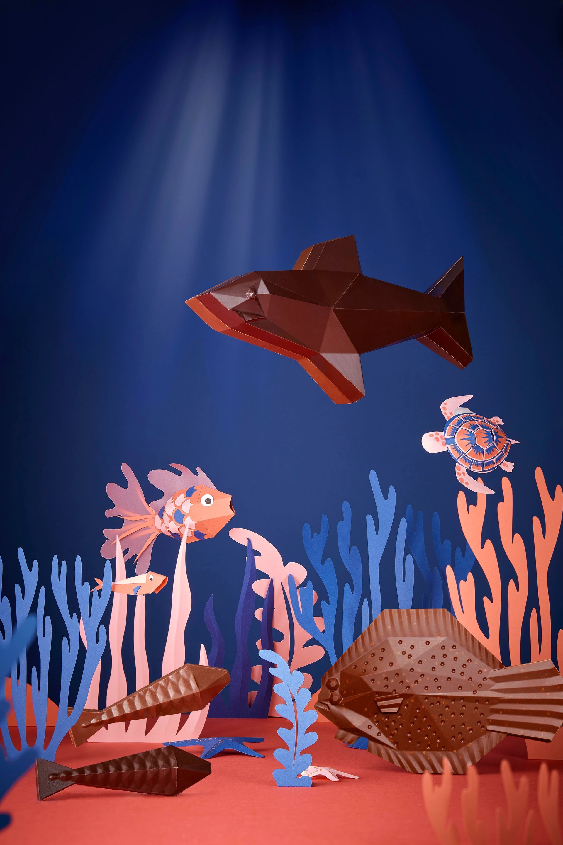 De son côté, Le Chocolat Alain Ducasse a fait appel au graphiste Pierre Tachon, de Soins Graphiques, pour concevoir des créations originales autour du thème « Pâques en Méditerranée ». Dans cette collection, petites sardines croisent requins en chocolat noir ou au lait, turbots en chocolat au lait crunchy ou homards déclinés en tablettes.