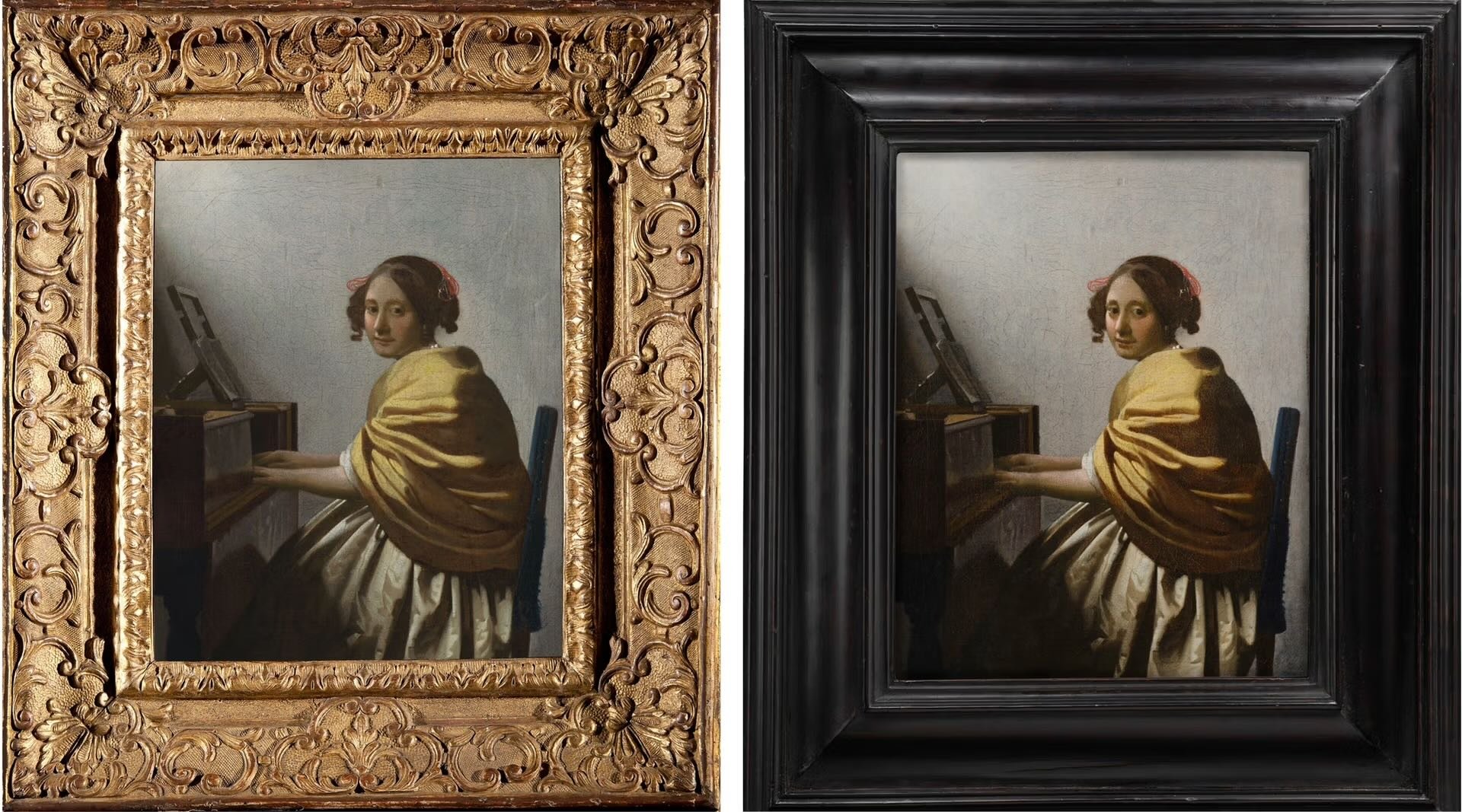 Johannes Vermeer, Dame jouant du virginal (1670-1675), avec son ancien cadre français orné et doré et le nouveau, hollandais en ébène noir de la fin du XVIIe siècle. Courtesy de la collection de Leyde