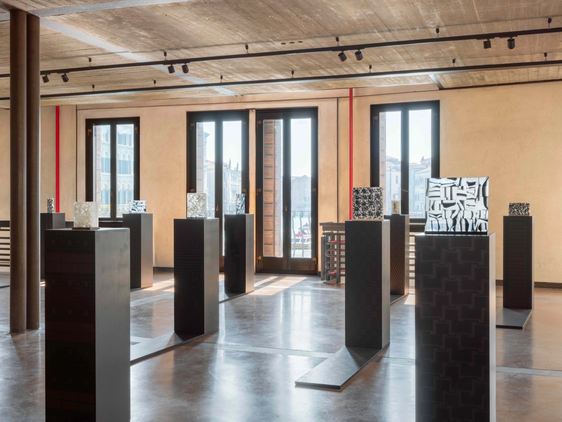 Cette attention portée à la circulation du regard trouve un écho direct dans l’exposition imaginée dans le cadre de la biennale. Au Rez-de-Chaussée, un jardin imaginaire prend place : les sculptures organiques en bronze de Gianluca Pacchioni y côtoient une tapisserie figurant une forêt printanière, réalisée par la manufacture Pinton d’après un carton du peintre Roger Mühl. Ce paysage inattendu renvoie à un épisode méconnu de l’histoire du lieu : en 1954, l’architecte vénitien Duilio Torres, répondant à la monumentalité du projet de Frank Lloyd Wright, proposait en alternative un petit jardin. À l’étage, comme en contrepoint, les sculptures en verre du duo Perrin & Perrin donnent naissance à des compositions architecturales où s’énonce un imaginaire urbain. Présentés sur d’élégants socles, ces derniers font part de tout un réseau de motifs géométriques, profondément graphiques, empruntés au vocabulaire de Scarpa, comme une subtile mise en abîme en guise d’hommage au maître vénitien.