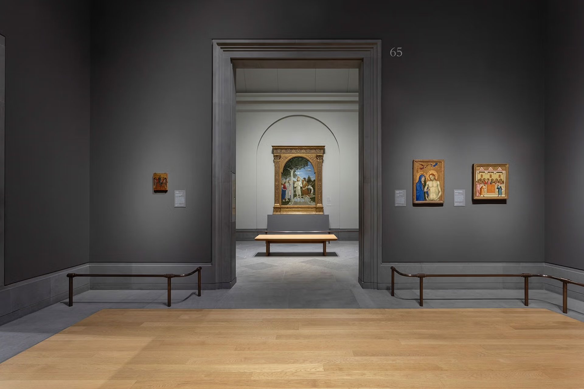 Le long de l’enfilade centrale, c’est plus d’un siècle d’évolution artistique qui se déploie : des anges nimbés d’or de Cione (1370-1371) jusqu’au paysage en perspective des frères Pollaiuolo (vers 1475), en passant par Cima da Conegliano, Carlo Crivelli ou Matteo di Giovanni. Les panneaux de la somptueuse Maestà de Duccio, actuellement exposés au rez-de-chaussée dans l’exposition « Sienne : la naissance de la peinture, 1300-1350 » (jusqu’au 22 juin), sont appelés à regagner prochainement leur place ici.