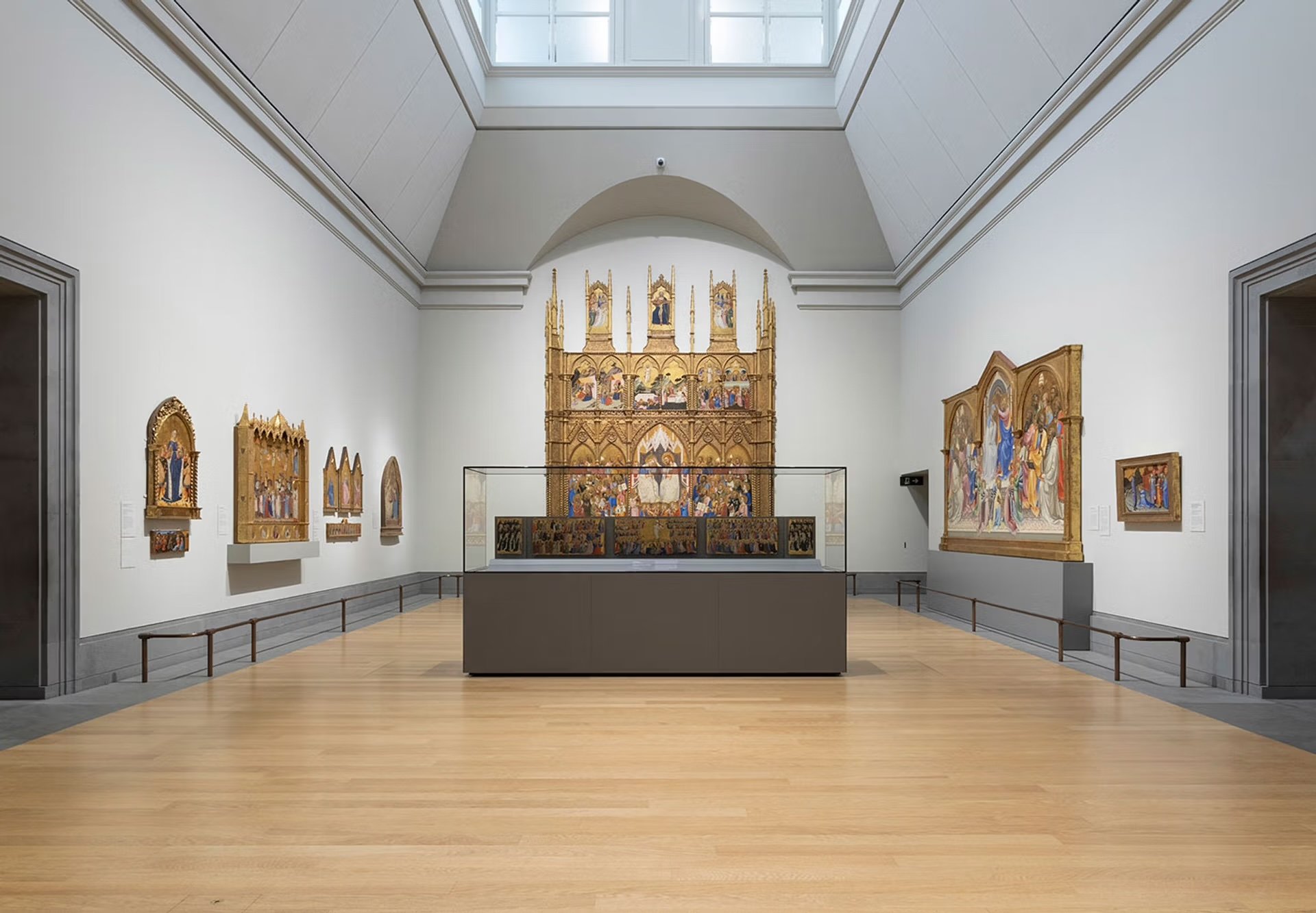 Réencadrées avec une rare finesse par Peter Shade, les deux œuvres reposent sur de sobres socles gris, réservés à travers tout le parcours aux retables majeurs. Devant le retable de Jacopo di Cione, une longue vitrine centrale présente les magnifiques panneaux d’autel de Fra Angelico provenant du couvent de San Domenico à Fiesole, désormais placés plus bas afin de mieux faire ressortir leur fonction originelle de prédelle. Suspendu dans l’espace qui les précède, le Crucifix de Segna di Bonaventura flotte au-dessus du sol – un choix audacieux, qui évoque la manière dont ces crucifix peints étaient traditionnellement accrochés au-dessus de la clôture de chœur dans les églises italiennes du XIVᵉ siècle. Le résultat est une forme de « trinité visuelle », une superposition d’expériences de regard, où les panneaux de Fra Angelico semblent prolonger ou compléter le retable de Cione.