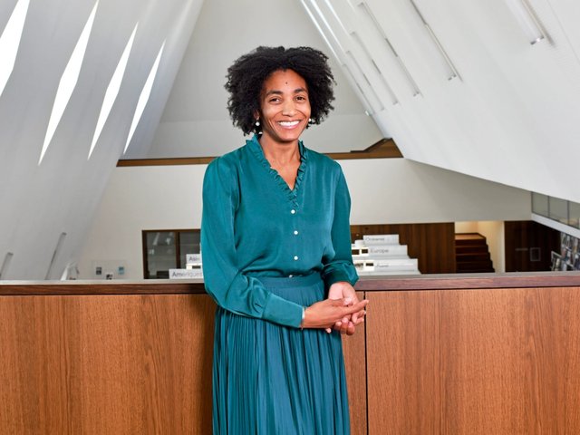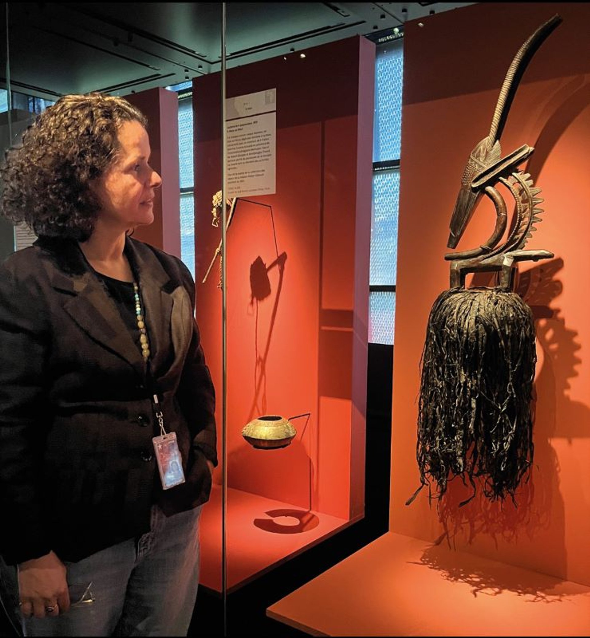 L’anthropologue Gaëlle Beaujean devant un masque cimier Ciwara Bamana acheté par la mission Dakar- Djibouti le 4 septembre 1931, musée du quai Branly – Jacques Chirac, Paris, 2025. Photo Bérénice Geoffroy-Schneiter