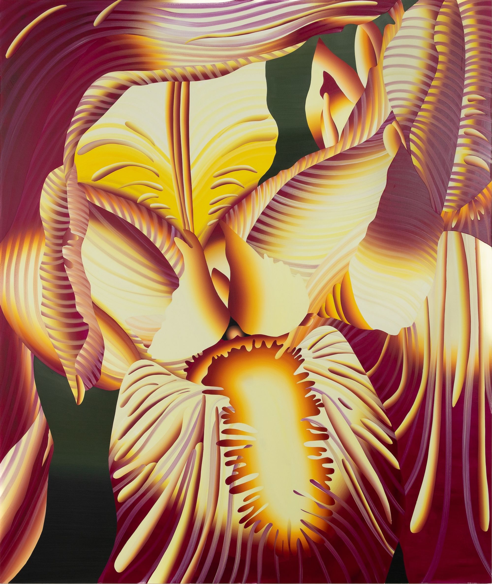 Laura Garcia Karras a peint une série de fleurs, des fleurs très agrandies qui occupent toute la surface de la toile et même au-delà, rappelant ainsi l’effet all-over. Le caractère décoratif n’est qu’un aspect de ces œuvres qui, au second regard, se révèlent des constructions complexes, des expérimentations entreprises avec un mixte de fidélité au modèle et de liberté absolue. En variant dans un même tableau, les manières, modelant certaines parties pour leur donner le maximum de relief ou, au contraire, peignant des tiges ou des rayures en aplat, l’artiste nous offre une diversité de points de vue, une vision cinétique et haptique. Le spectateur a la sensation d’entrer dans la fleur en traversant des plans successifs et de reconnaître les étapes du processus pictural. Tel tableau intitulé Paon trace un extraordinaire chemin vers la lumière à travers des motifs de rayure détachés de leurs pétales et des étamines jaillissant en gouttes. Tel autre nommé Giu déconstruit littéralement le motif, nous projetant par une gradation de bleu du pistil vers un ciel où rayonne un astre cuivré. L’élargissement de la réalité et le glissement vers l’abstraction s’accomplissent par accumulation de détails et excès de netteté. La réunion de ces fleurs a quelque chose d’explosif.