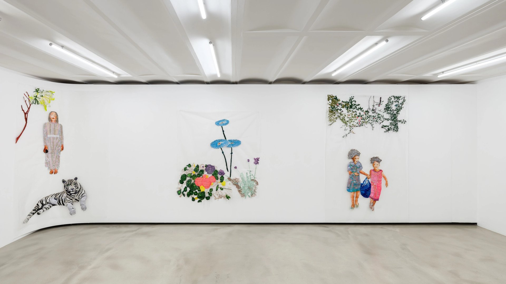 « As guardiãs » (les gardiennes) : c’est par ce terme qu’Ana Silva veut célébrer les groupes de femmes qui « exercent un rôle de veille et de protection » autour du village d’Angola où se trouve la maison de sa famille. Pour cette nouvelle série d’œuvres brodées, elle a remplacé les sacs et tissus de création par la crinoline, étoffe dont le nom a été capturé par l’objet que l’on sait. Cette toile blanche et translucide, avec parfois un léger effet moiré, équivaut à une absence de fond, donnant aux parties brodées un plus grand relief et les faisant flotter dans l’espace. Chacune des femmes ou des enfants se trouve associée à une figure animale, à un arbre, ou à une plante, sans qu’on puisse décider avec certitude du lien qui les unit : proximité spatiale, rapport symbolique. Parfois, l’humain fusionne avec le végétal en ce qui pourrait être l’effet d’une transe ou une illumination. Les visages ou les membres des figures humaines sont peints d’une teinte délavée, comme des images insolées. Par le biais d’un art décoratif renouvelé, Ana Silva unit approche documentaire et vision. Emblématique à cet égard est cette composition dans laquelle une gardienne se tient sous un arbre maigre où vient, entre deux sacs de plastique rose suspendus, se poser un papillon géant. C’est comme un Klimt de la savane venu nous entretenir de l’état de la planète.
