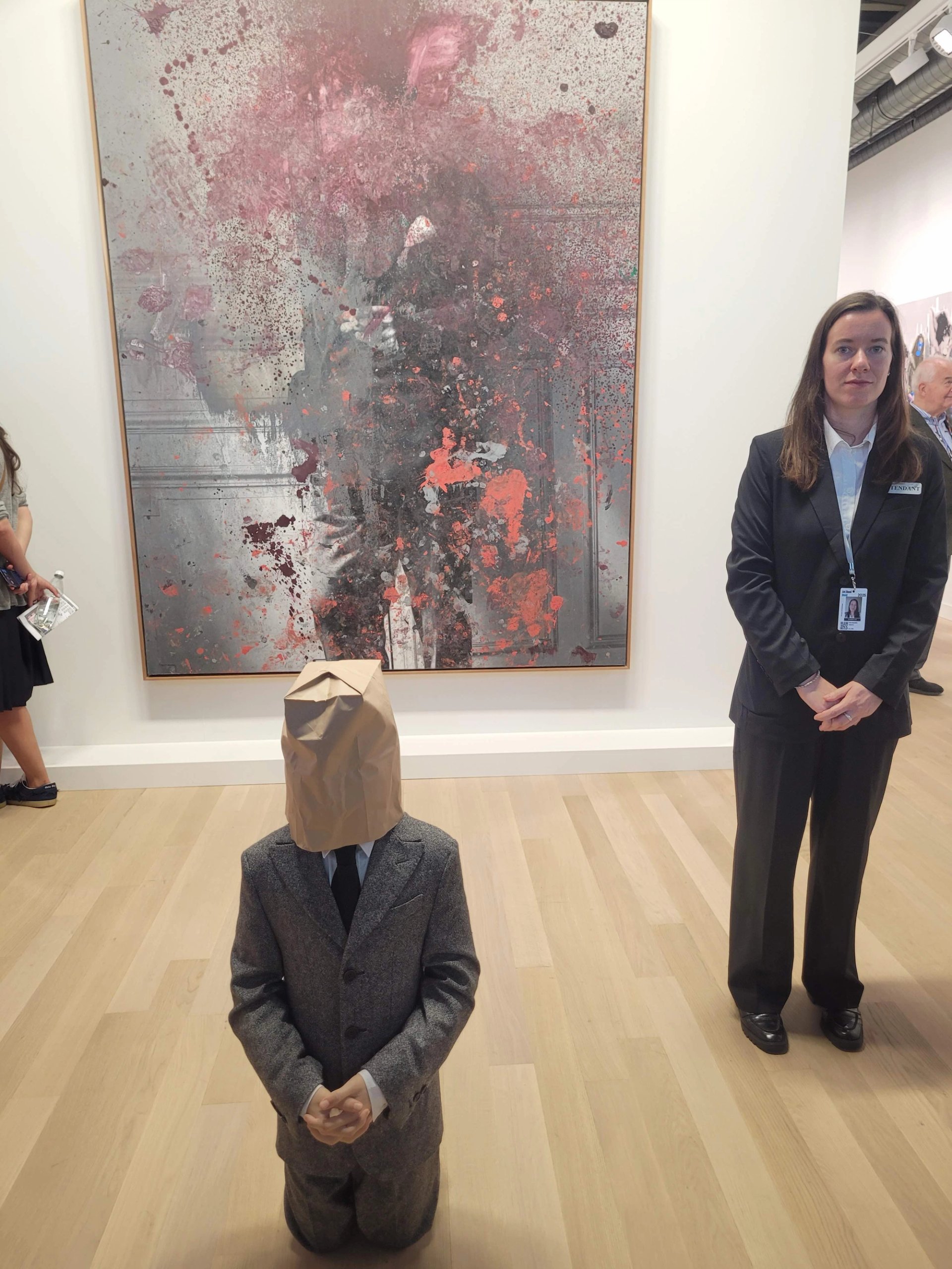 Picasso par ci, Picasso par là. Tous les visiteurs notaient à la preview de cette édition 2025 d’Art Basel la surabondance d’œuvres du peintre espagnol au rez-de-chaussée, sur de nombreux stands, de Pace à Hauser & Wirth (avec un Mousquetaire à la pipe de 1968 montré en 1981 au Kunstmuseum de Bâle). Le XXe siècle et ses plus grands noms font plus que jamais recette en cette période d’incertitudes géopolitiques et économiques. Chez Pace, un Rothko et un Picasso sont affichés à plus de 30 millions de dollars, et un Joan Mitchell entre 15 et 20 millions de dollars. Chez Gagosian, ce sont Twombly, Picasso et un énorme Albert Oehlen surplombant une figure agenouillée par Maurizio Cattelan, célébrissime œuvre dont la tête a cette fois été recouverte d’un sac en papier. « Nous avons eu des ventes à tous les niveaux de prix, entre 30 000 dollars et des montants à 8 chiffres, ce qui montre la profondeur du marché », assure la galerie. La Foire semble avoir bien démarré malgré le contexte. « On s’attendait à une baisse du marché depuis longtemps, elle est arrivée. Nous n’avions pas beaucoup d’attentes vu la situation mondiale mais l’ouverture s’est bien passée : nous avons facturé et vendu 11 œuvres », confie Almine Rech. Selon des transporteurs, les marchands auraient acheminé un nombre d’œuvres plus restreint qu’à l’accoutumée, afin de s’adapter à un contexte moins frénétique.