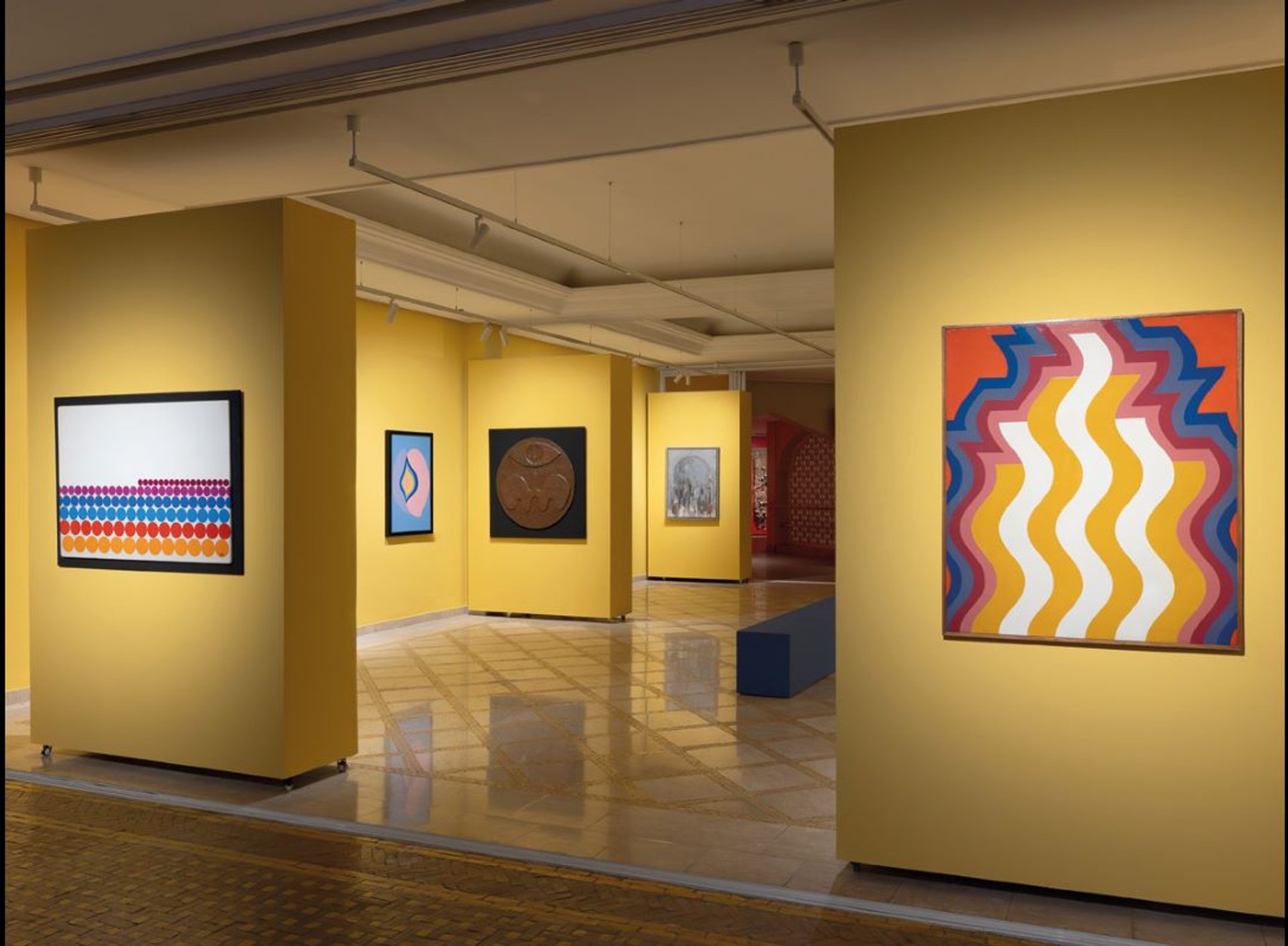 Comme l’écrit Brahim Alaoui, ancien directeur du musée de l’Institut du monde arabe, à Paris, à propos de Farid Belkahia, Mohamed Melehi et Mohamed Chebâa : « Ces trois figures charismatiques incarnent la modernité postcoloniale au Maroc, élaborée dans les années 1960 autour de l’École de Casablanca. » Les principaux acteurs de celle-ci sont largement représentés, notamment Farid Belkahia, dont on retrouve les célèbres œuvres en peau, mais aussi une peinture précoce de 1962. L’histoire de l’art du monde arabe – les Biennales de Rabat en 1976 et de Bagdad en 1979 – est comme un sous-texte de l’exposition ; on aurait même eu envie d’en apprendre davantage par la médiation.
