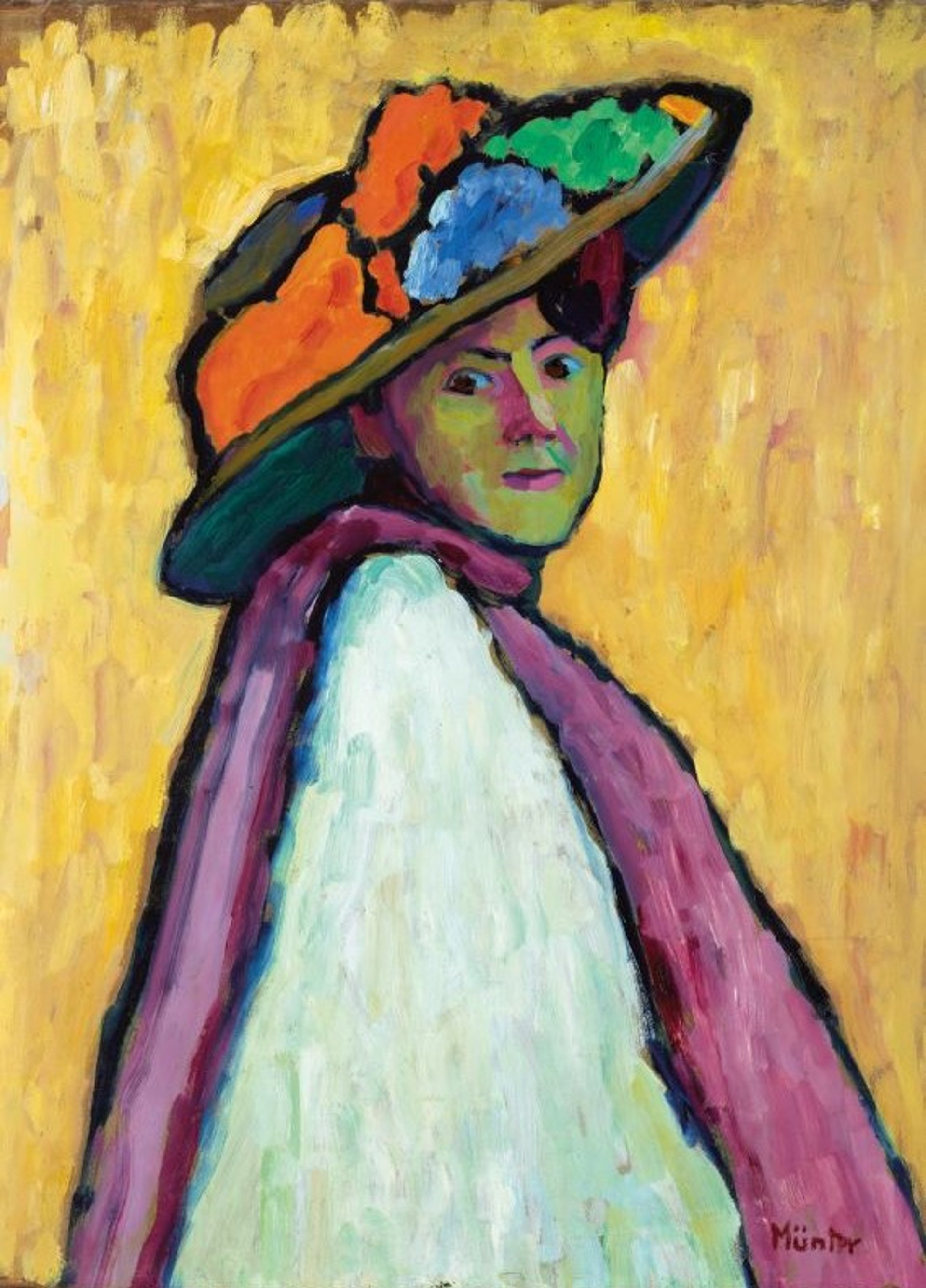 De retour en Allemagne, après avoir exposé pour la première fois au Salon des Indépendants et au Salon d’Automne (1907), Gabriele Münter délaisse donc l’esthétique postimpressionniste qui était la sienne pour cette approche renouvelée. Elle associe couleurs franches, formes synthétiques, cernes et fonds monochromes, abandonne les effets de perspective, accentue l’expressivité de son style. Là encore, c’est dans le domaine du portrait que la jeune femme se livre aux recherches les plus audacieuses, à l’exemple de l’effigie de son amie Marianne von Werefkin (1909) qui rappelle La Femme au chapeau d’Henri Matisse (1905), probablement vu chez Gertrude et Leo Stein, à Paris. De même, À l’écoute (1909), portrait du peintre Alexej von Jawlensky, n’est pas sans évoquer d’autres œuvres d’Henri Matisse, dont Marguerite (1907), qui reflète le primitivisme grandissant des avant-gardes européennes.