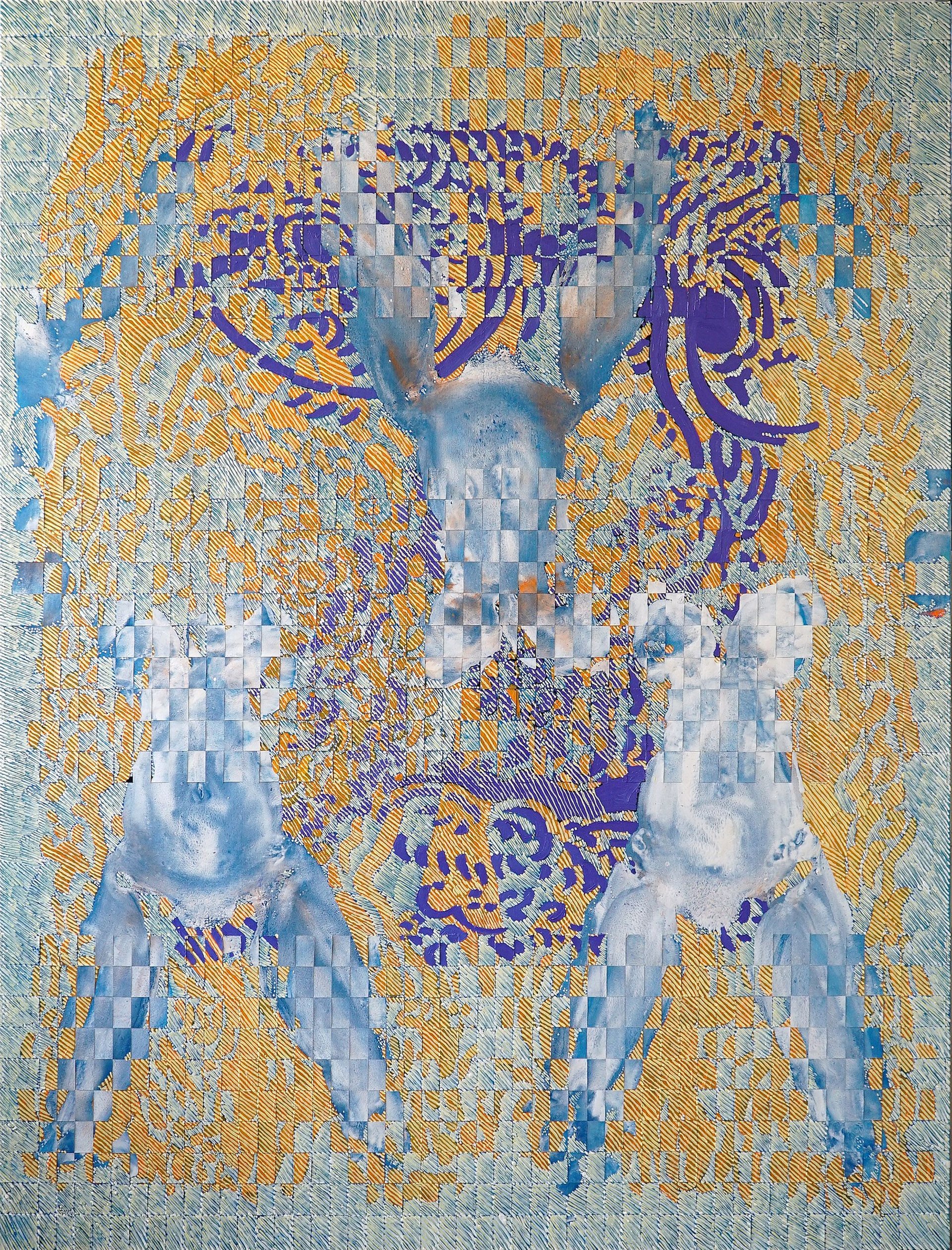 À cette série succède en contrepoint celle des Coquilles, où le corps, vivant, féminin et profondément sexué, reprend place. Ses empreintes acéphales – cuisses, torses, seins – s’imprègnent sur la toile et le papier, toutes mêlées à une prolifération dense de touches et de trames chamarrées. Défiant l’immédiateté du regard, la composition ne se donne jamais dans sa totalité tant elle se brouille et se dérobe, prise dans un élan de complexité et de sensualité fantomatique.
