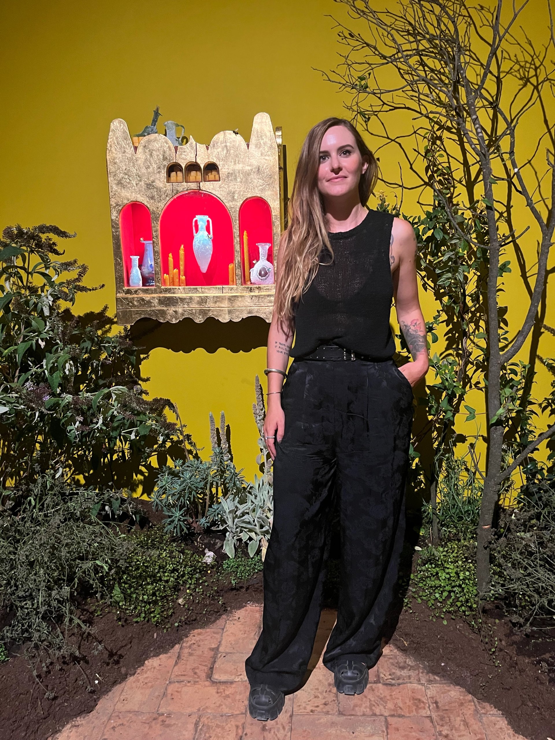 Bianca Bondi dans son installation The perennial truth/ empires do fall/ into perfect geometries/ of stone, 2025. Techniques mixtes (bois, feuille d’or, cire d’abeille, glycérine, végétation, lumières de croissance). Objet en verre : Aldo Frasca & Paolo Rossi. © Bianca Bondi & Galerie mor charpentier. Photo : Stéphane Renault