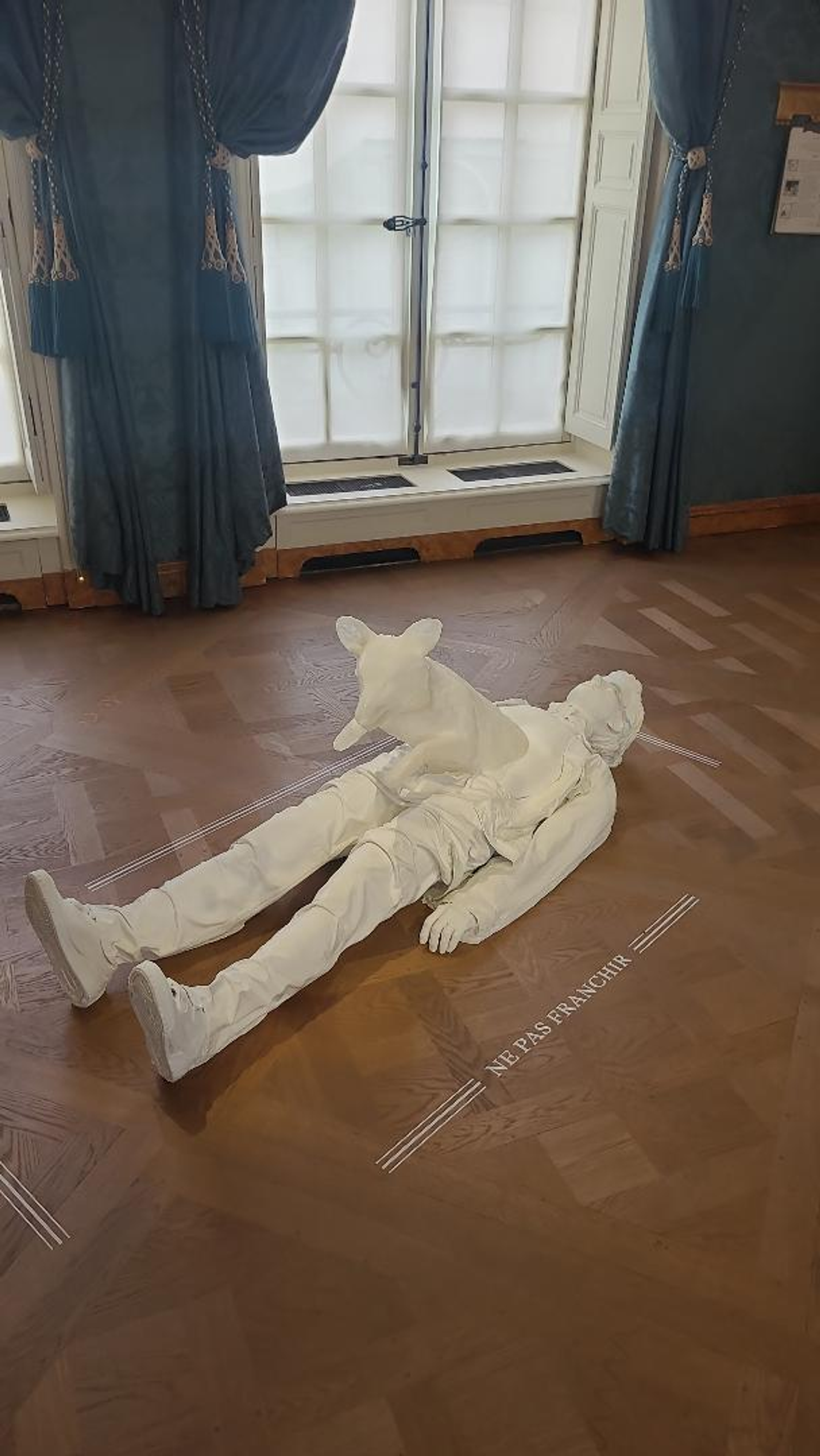 C’est non sans humour que l’artiste nous présente donc sa famille au premier étage, dans une salle précisément baptisée « Portrait de famille ». Cette fois, les biches, ratons laveurs, marmottes sont représentés seuls, en majesté sur fond blanc. Mais à y regarder de plus près, ils sont assurément un peu étranges, les yeux fardés pour l’un, une couronne sur la tête d’un autre… Pour rappeler que « je » peut bien être un autre ? Plus loin, l’artiste fait dialoguer dessins et céramiques avec les étonnantes collections du musée. Un renard sort du torse d’un jeune homme allongé au sol, en pleine réincarnation… L’esprit d’Orphée et de Cocteau n’est jamais très loin. Au-delà de l’appel à la nature, l’artiste délivre ici un message d’ouverture et d’harmonie qu’il serait judicieux de voir et d’entendre sans tarder.