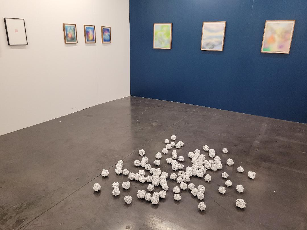 Sur le sol du stand de la galerie Meessen, une centaine de boules de papier froissées en aluminium émaillé laissent apparaître des phrases de la dernière page de Casse-pipe, un livre inachevé de Louis-Ferdinand Céline. Cette installation à 34 000 euros, signée de l’artiste mexicain Jorge Mendez Blake, évoque les affres de l’écriture et son processus laborieux de gestation.