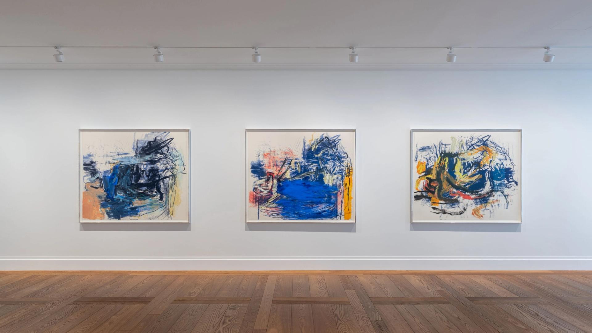Dans le grand espace de la galerie, un seul tableau est disposé sur chacun des murs et aucune lumière artificielle ne vient s’ajouter à celle que diffuse la verrière. Ce sont des œuvres de grand format en deux panneaux de dimensions égales superposés à l’horizontale ou accolés à la verticale. Il ne s’agit pas de diptyques et les formes ovoïdes ou demi-ovoïdes peuvent se trouver à cheval entre deux panneaux.