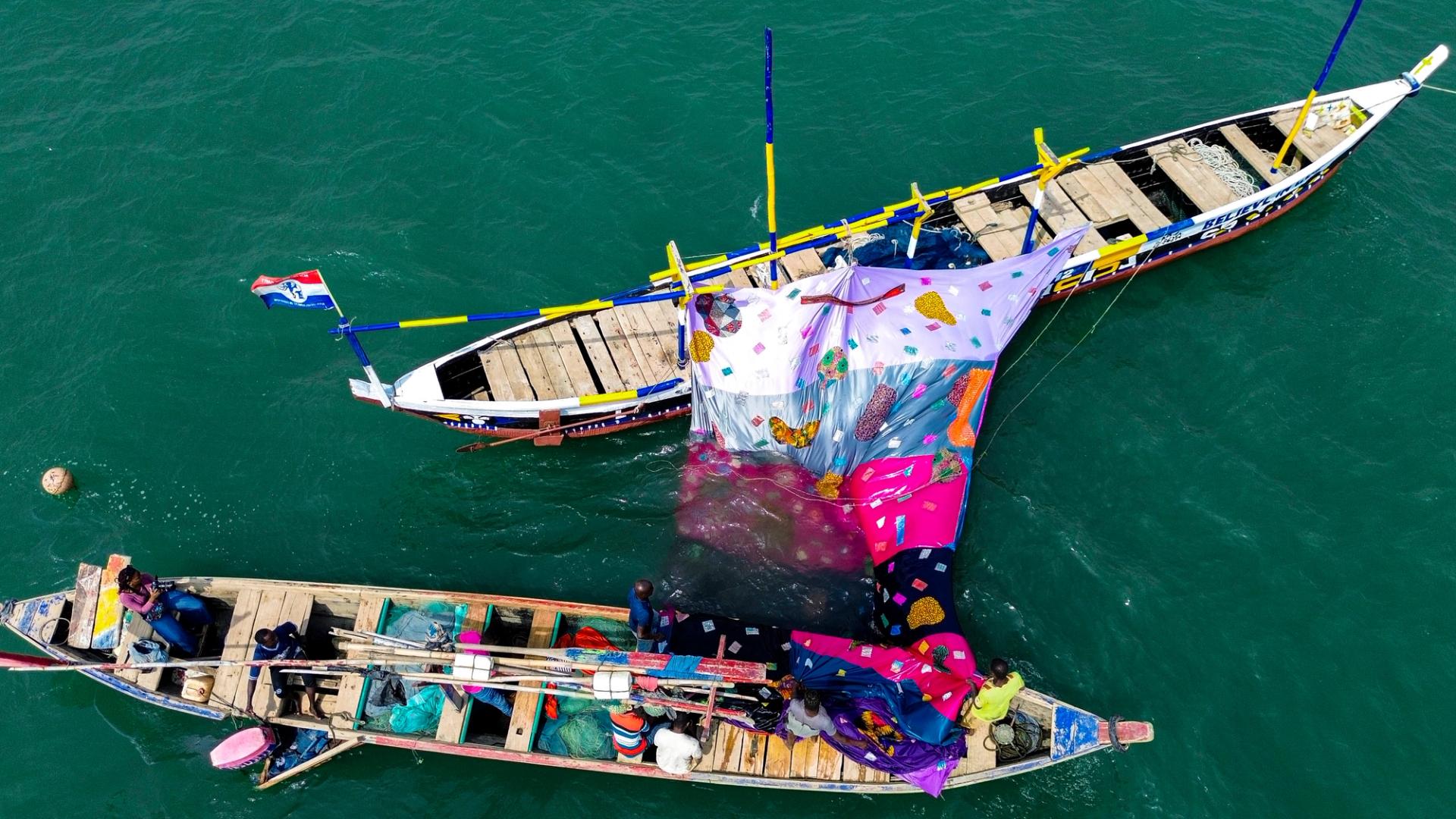 Emmanuel Aggrey Tieku, Where Do We Go from Here, How to Heal a Broken World, 2025, 11 x 1,2 m, installation textile.