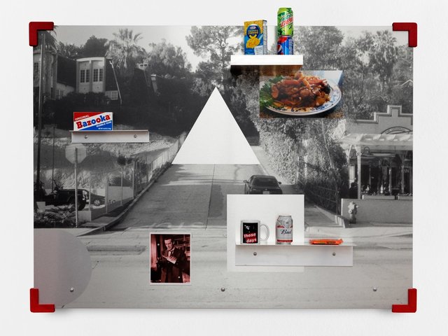 Sans s’écarter de sa voie consistant à organiser la décomposition pour célébrer la vie, Michel Blazy nous offre une incursion dans l’imaginaire du voyage, et du voyage planétaire en particulier. Les valises d’aluminium d’où sortent des avocatiers nous rappellent les premiers explorateurs importateurs de plantes, tandis que les cactus queue-de-rat qui débordent de verres cassés amènent leur part d’exotisme teinté de danger. Avec le concentré de tomates qui lui avait servi autrefois à renouveler la peinture murale, Michel Blazy a peint deux tableaux monochromes devenus des visions de cosmos. À l’abri derrière des caissons de verre acrylique, ces deux œuvres éblouissent par l’intensité du carmin et le chatoiement des moisissures. La part de répulsion plus ou moins légère, caractéristique de cet art, tend à s’effacer au profit d’une beauté qui nous renvoie aux premiers maîtres de l’abstraction. Dans un esprit proche du symbolisme et une délicatesse d’aquarelliste, l’artiste a peint des planètes avec du jus de betterave. La révélation de ce légume l’a conduit à réaliser une étonnante sculpture-installation : Rejoindre le cosmos avec le réfrigérateur. Il s’agit d’une structure verticale en aluminium parasitée par des dizaines de créatures faites d’un morceau de betterave dans lequel ont été piqués des macaronis. Quelques-unes d’entre elles ont quitté la structure pour arpenter les murs. Le titre peut désigner l’objectif de ces créatures, ou valoir pour l’art de Blazy en général. En tout cas, les betteraves sont lâchées.