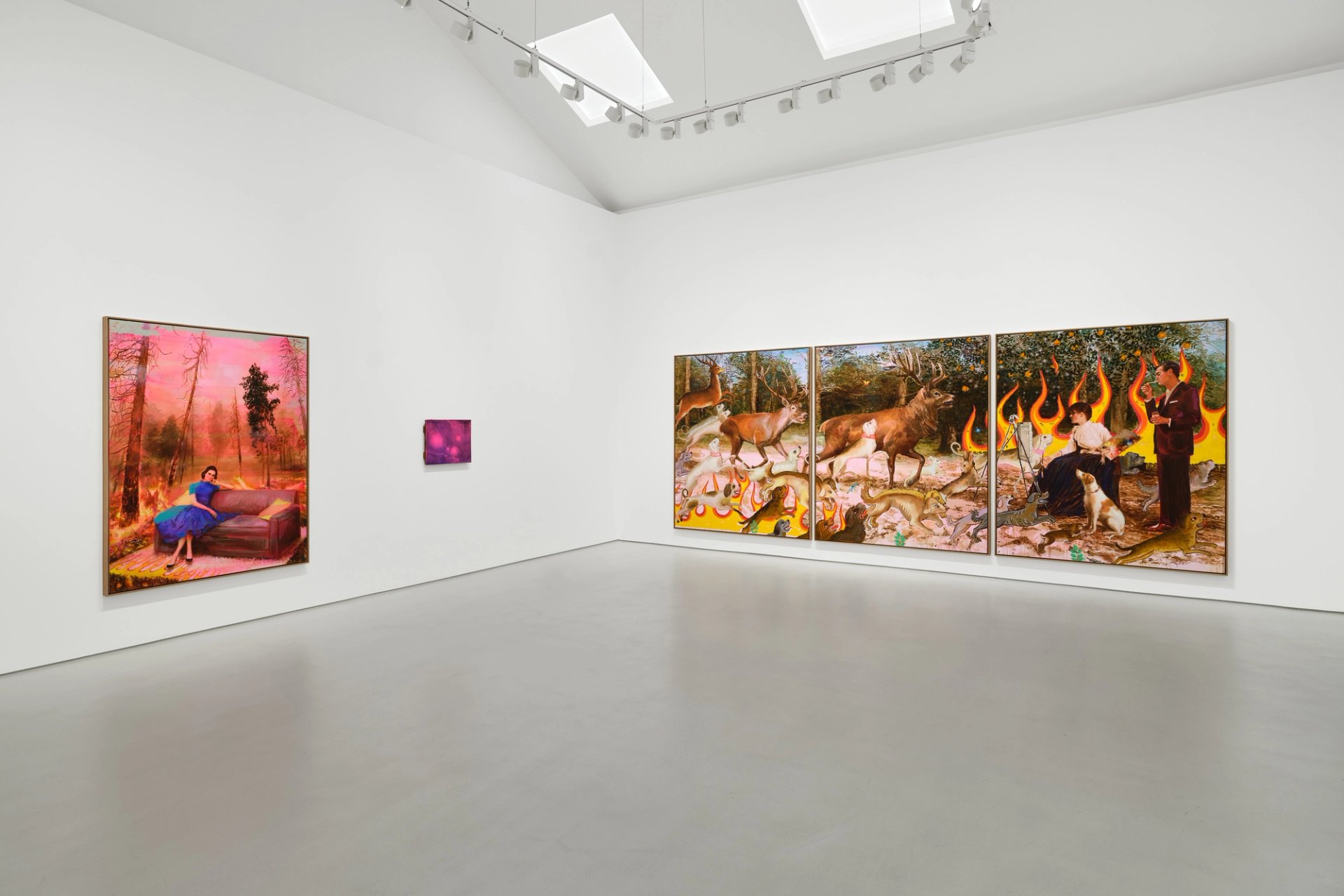 Autour de ce triptyque d’inspiration « courbétienne », les tableaux roses construisent une séquence sur les pouvoirs de la peinture. Des natures mortes de mégots ou d’un tas de billets de banque sont là pour traduire la vanité, une élégante étendue sur un sofa au milieu d’une forêt incandescente incarne la mélancolie, humeur d’artiste comme chacun sait. Pour l’autoréflexivité, on trouve une femme qui a trempé ses doigts dans la couleur, pour le drame une maison qui brûle, et pour l’infini un ciel étoilé. Tursic & Mille citent Ed Ruscha ou Marcel Duchamp, se citent eux-mêmes et offrent une méditation teintée d’ironie sur l’art et le succès, quand tout brûle.