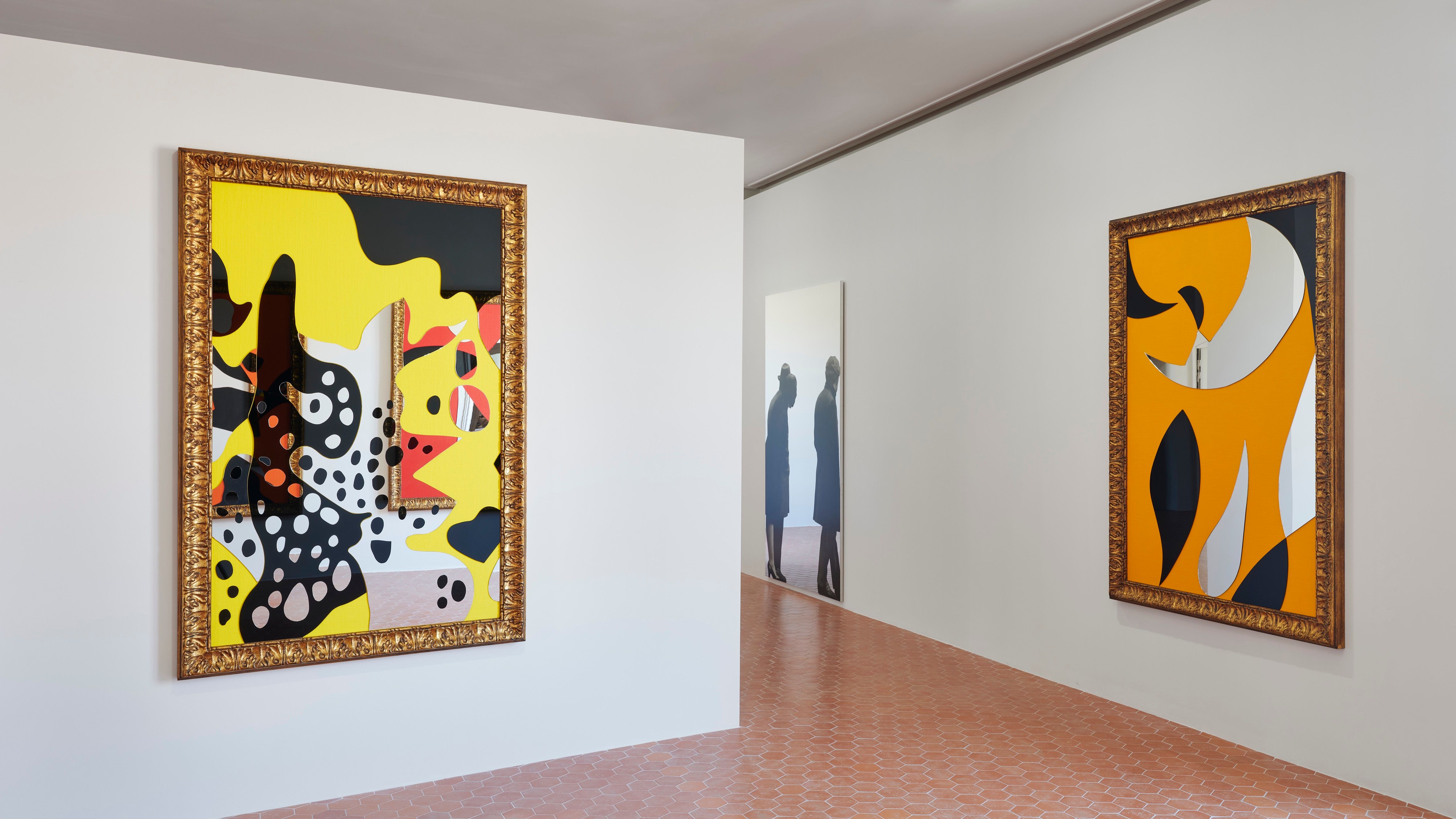 Vue de l’exposition « A Conversation Piece. Michelangelo Pistoletto et Lee Ufan en dialogue ». Au premier plan (à droite et à gauche) : Michelangelo Pistoletto, Color and Light, 2024, miroirs noir et blanc, jute, bois et cadre doré ; à l’arrière-plan : Attesa n. 1, 1973, sérigraphie sur acier inoxydable poli miroir, Lee Ufan Arles, 2025. Courtesy de l’artiste et de la Galleria Continua