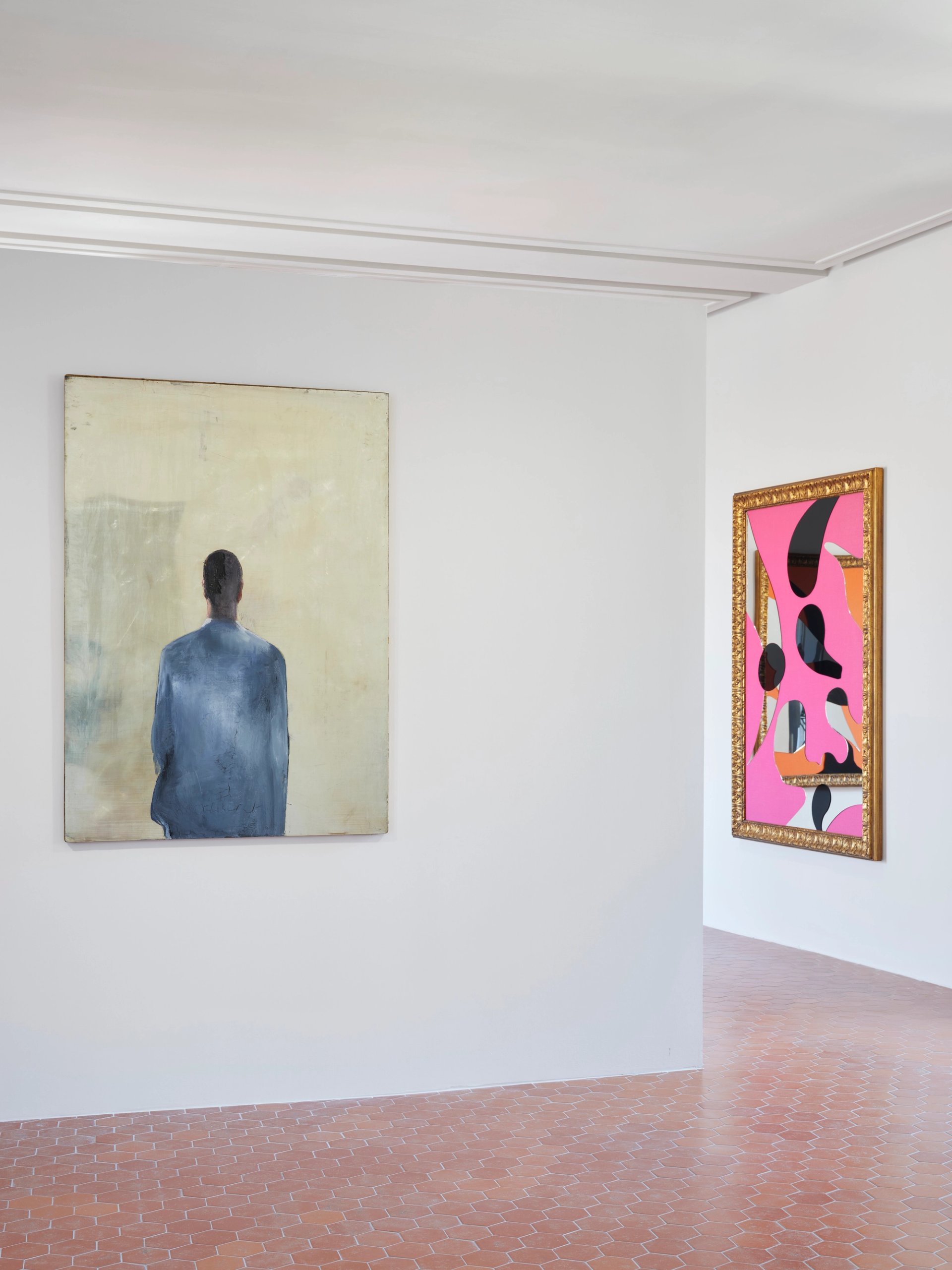 Vue de l’exposition « A Conversation Piece. Michelangelo Pistoletto et Lee Ufan en dialogue ». À gauche : Michelangelo Pistoletto, Uomo grigio di schiena, 1961, acrylique et peinture à l’huile sur aluminium poli sur toile ; à l’arrière-plan : Color and Light, 2024, miroirs noir et blanc, jute, bois et cadre doré. Courtesy de l’artiste et de la Galleria Continua