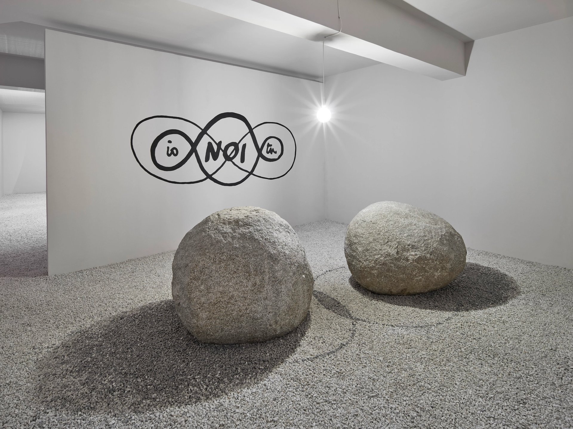 Vue de l’exposition « A Conversation Piece. Michelangelo Pistoletto et Lee Ufan en dialogue ». Au premier plan : Lee Ufan, Relatum – Accès, 2022, 2 pierres naturelles, 2 ombres peintes au sol, ampoule, gravier ; au second plan : Michelangelo Pistoletto, Io-Tu-Noi, 2025, peinture noire. Courtesy des artistes / Lee Ufan Arles