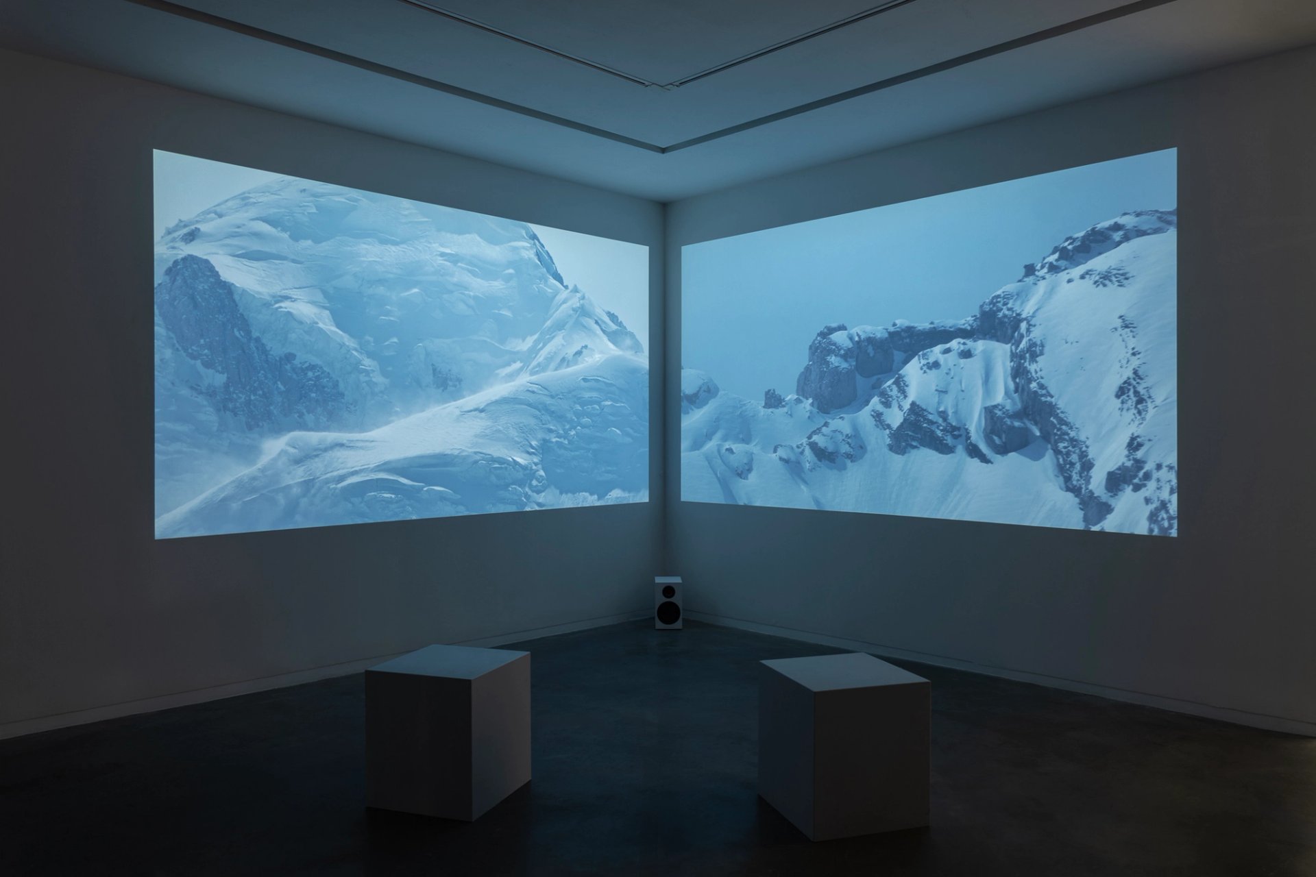 « Là où s’effondrent les dragons » vient après la présentation de l’installation Dérives Alpines au Centre d’art de Flaine (Haute-Savoie), au terme d’une résidence en ce lieu. Montré en double projection, Dérives Alpines a été tourné durant plusieurs saisons, au cours de randonnées effectuées par l’artiste et son chef opérateur. Le sujet du film, c’est un glacier, exploré sous différents angles, et qui se raconte par le biais d’un surtitrage. Le monologue du glacier mêle données factuelles et considérations esthétiques. Le ton adopté par ce monument naturel reste relativement neutre ; sa fin, lucidement envisagée, devant normalement suffire à inspirer l’effroi. Le choix de focale a permis d’obtenir un point de vue à hauteur d’humain et sans déformation de l’image. On a parfois le sentiment d’être très près et cependant, presque au milieu du film, une vue plongeante sur des skieurs nous fait mesurer la distance. Aucun son ambiant n’a été employé pour la piste sonore confiée à Valentin Ferré. Les dragons du titre renvoient aux légendes circulant du XVIe au XVIIIe siècles qui assimilaient les langues des glaciers à des monstres. L’artiste s’est inspirée des motifs de ces langues pour exécuter un ensemble de céramiques blanches, craquelées, qu’elle a suspendues avec des pierres comme contrepoids. Ces formes ont ensuite servi de modèles pour des dessins à l’encre dans l’esprit des livres d’histoire naturelle. Approcher du glacier et apprivoiser les peurs sont étroitement liés.