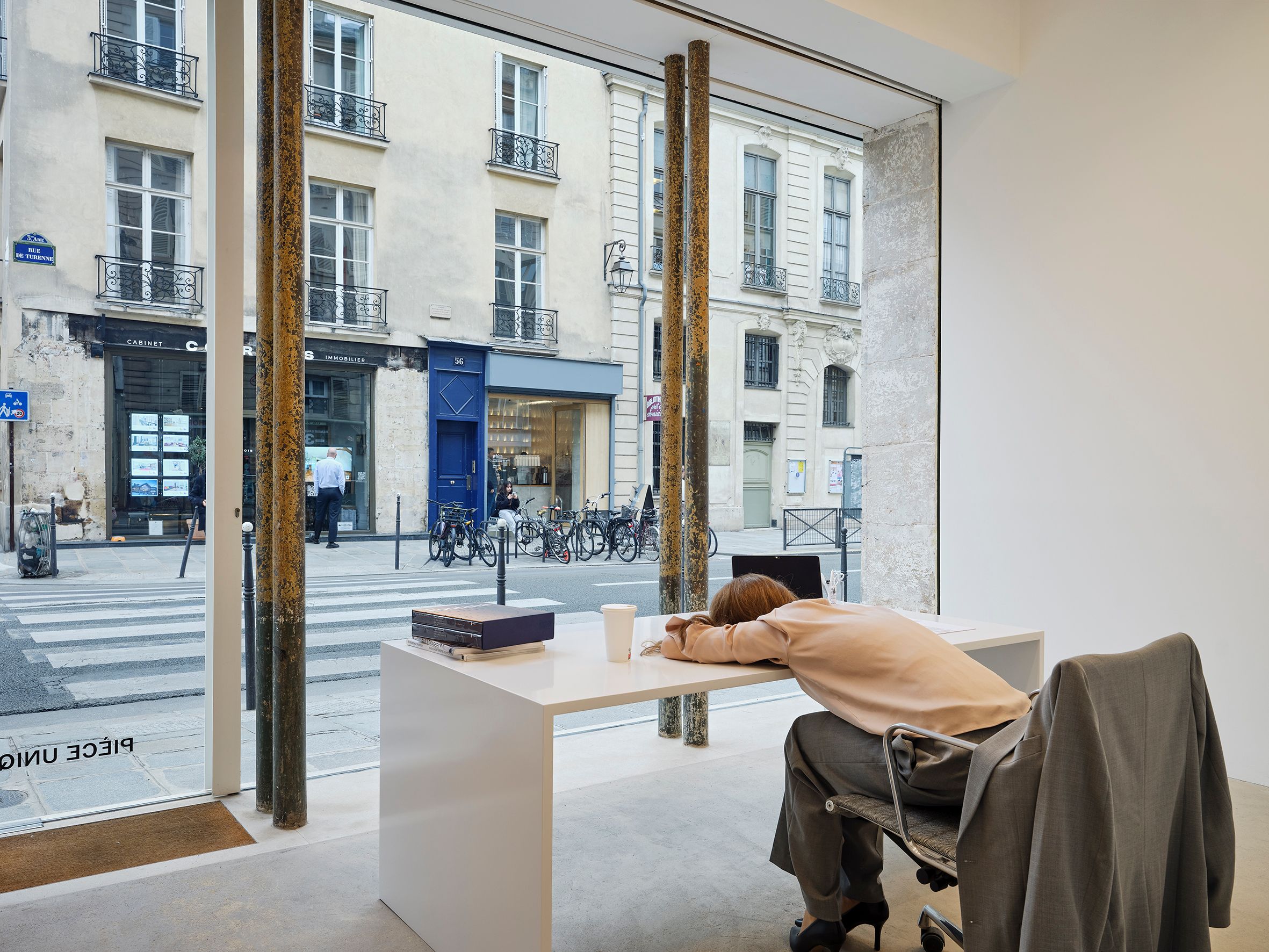 Avec October 2025, Elmgreen & Dragset nous offrent une œuvre in situ dans leur manière étrange et parodique. L’espace d’exposition en vitrine a été transformé en un deuxième espace d’accueil et, dans celui-ci, se tient assise la sculpture hyperréaliste d’une jeune femme en chemisier clair et strict tailleur pantalon. Elle est étalée de tout son buste sur son bureau, paupières closes. Ce qui nous fait immédiatement reconnaître une galerie d’art, c’est la présence au mur d’un authentique Concetto Spaziale doré de Lucio Fontana, celle d’un volume du catalogue raisonné du même artiste sur le bureau au-dessus de deux monographies d’Elmgreen & Dragset. Ces détails et le jeune âge de la personne la désignent comme une assistante. Savoir si son sommeil est l’effet d’une suractivité ou répond à un besoin de s’abstraire de la situation, la question fait partie du sujet. On remarque que de l’ordinateur portable aux vêtements, et jusqu’à la tapisserie du fauteuil, tout est noir, blanc ou gris. L’option prise d’inclure un Lucio Fontana dans la scène est particulièrement bienvenue. La fente du tableau fait comme une porte des rêves et l’on peut croire que cette œuvre se trouve reproduite dans le volume qui est sur la table. L’assistante est suspendue entre rêve et réalité, insérée dans un circuit d’auto-référentialité, et, depuis la rue, l’ensemble s’offre comme un tableau.