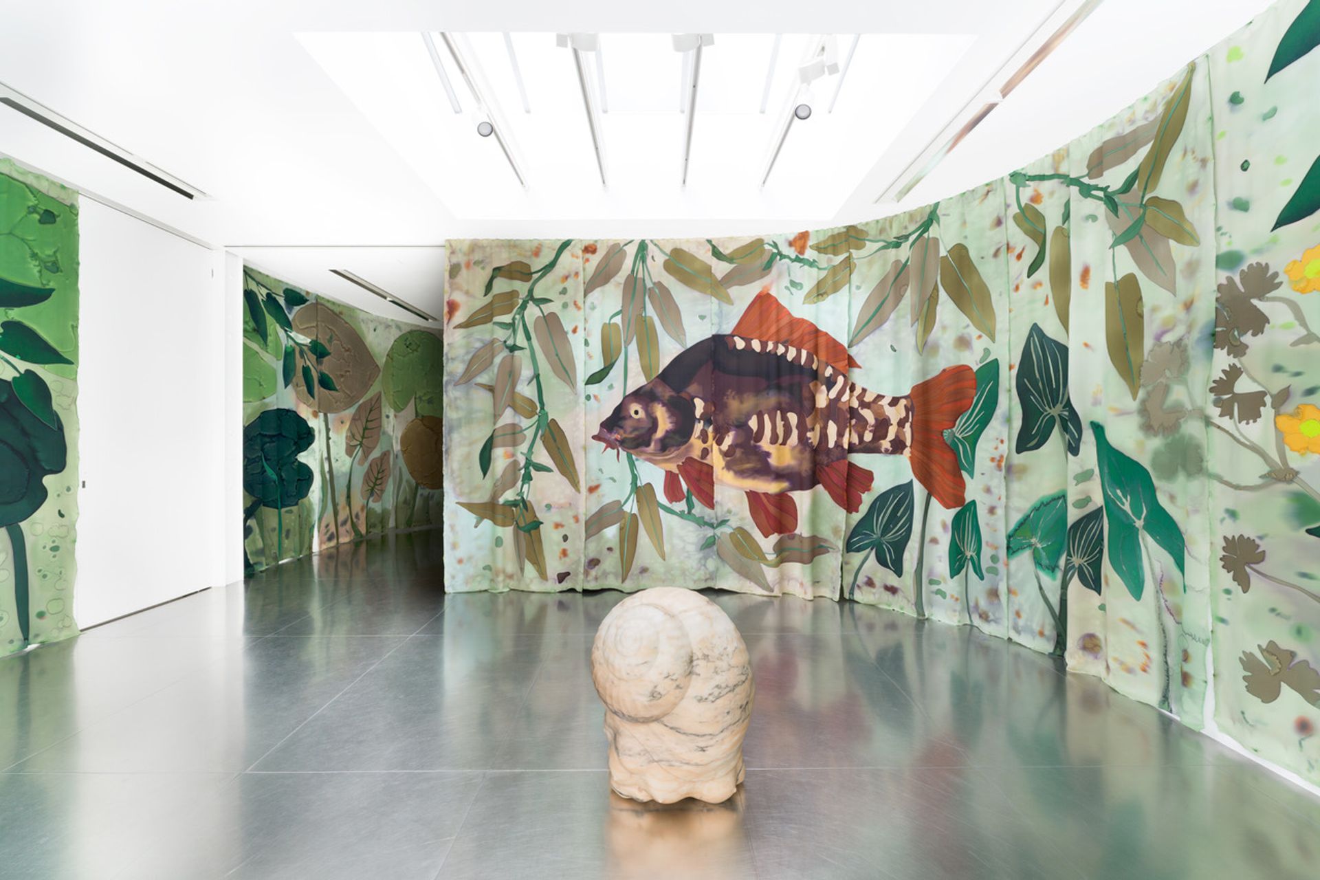 Avec « La Sève et la Vase », Daniel Dewar et Grégory Gicquel s’offrent une exposition en deux volets très nettement différenciés. La vase pourrait se référer à la présentation au n° 6 de la rue Jacques Callot d’un très long rideau de soie qui serpente à travers la galerie et la divise en deux. Sur lui est peint une gigantesque carpe dans des tons de jaune, brun et terre cuite, et des plantes majoritairement aquatiques. L’installation tient l’équilibre entre un décoratif précieux de vague inspiration asiatique, et une expérience immersive sous des nymphéas. Dans cet espace transformé est posée une sculpture en marbre qui mêle des escargots et des fragments de corps humains.