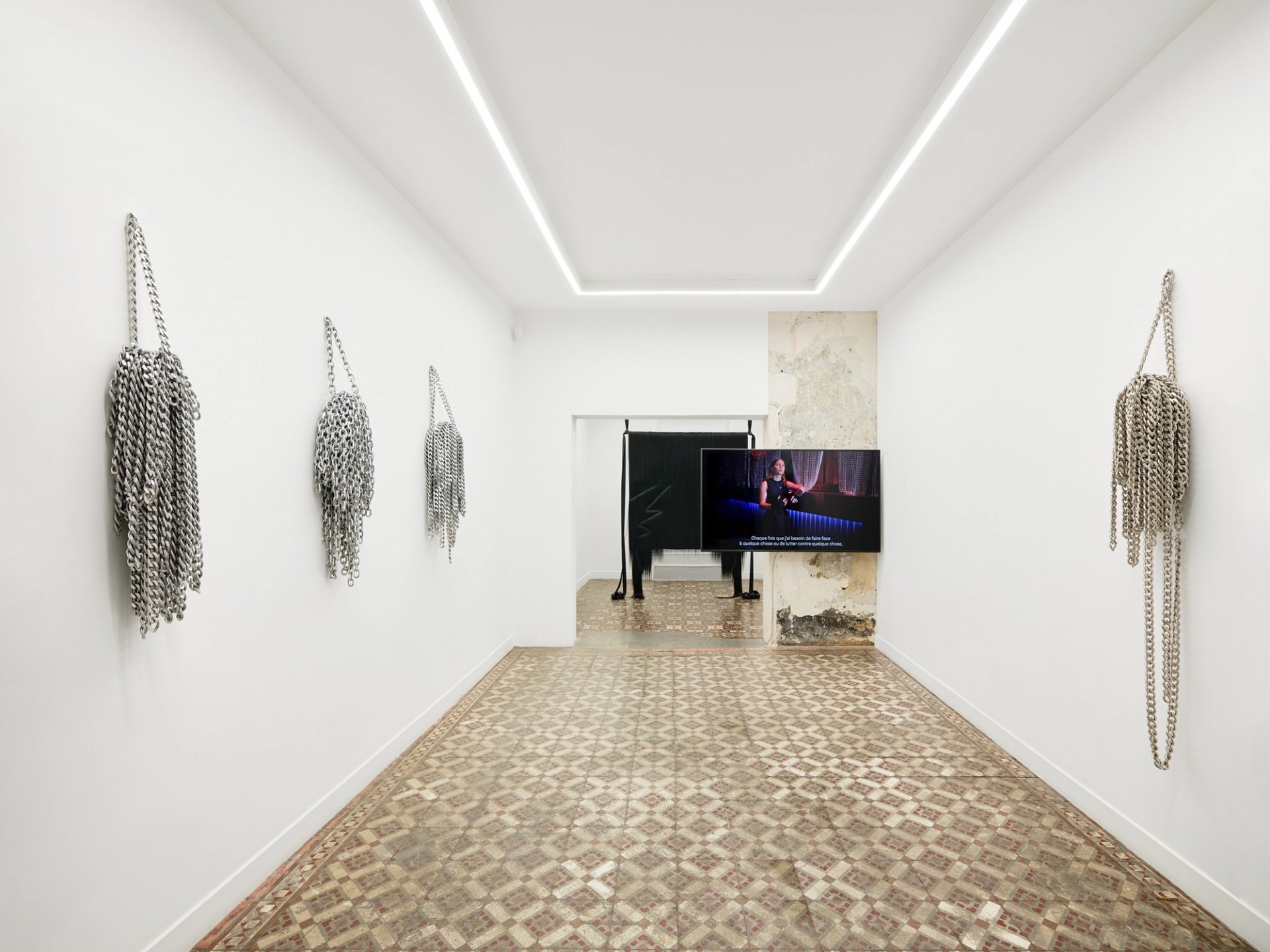 Chez Pauline Boudry/Renate Lorenz, la performance, le film et l’exposition ne sont pas des domaines séparés. « Right Body, Wrong Time », titre de l’exposition, est aussi celui d’une série de nouvelles pièces en chevelures artificielles noires. Ce sont des tentures portées par des lanières de feutre et qui sont marqués d’empreintes triangulaires. Les perruques symbolisent avant tout pour les artistes la possibilité de changer de genre. À côté de ces pièces en perruques, sont montrés des blocs de chaînes d’acier suspendues au mur. Les chaînes comptent également beaucoup dans le répertoire du duo en raison de leur polysémie : instrument d’oppression, symbole d’attachement, accessoire sexuel ou bijou chic. Ces nouvelles sculptures résonnent particulièrement avec l’installation All the things she said, composées de deux films consacrés à Chelsea Manning. Le titre peut être entendu à la fois comme une référence à la gigantesque fuite d’informations classifiées qui l’ont rendue célèbre et de tout ce qu’elle a pu rapporter de ses expériences. Dans leur film I Want (2015), Sharon Hayes récitait notamment des textes de Manning, alors incarcérée, et portait une perruque en hommage à une photo de l’héroïne. Les deux films de 2024 ont été tournés au SchwuZ, le plus ancien club queer et trans berlinois. Dans l’un des films, Chelsea Manning raconte comment la musique fut sa planche de salut alors qu’elle se trouvait à l’isolement. L’autre film nous fait assister à une de ses performances de Djaying sur la scène du club déserté. La caméra est fixée sur la musicienne puis se déplace et le son avec elle, pour trouver un équivalent filmique à l’expérience du concert. C’est la célébration d’une figure héroïque et du pouvoir de la musique, un écho au go-go danseur de Felix Gonzalez-Torres. Boudry et Lorenz en appellent à la complicité des visiteurs auxquels elles s’adressent directement par une lettre collée au mur.