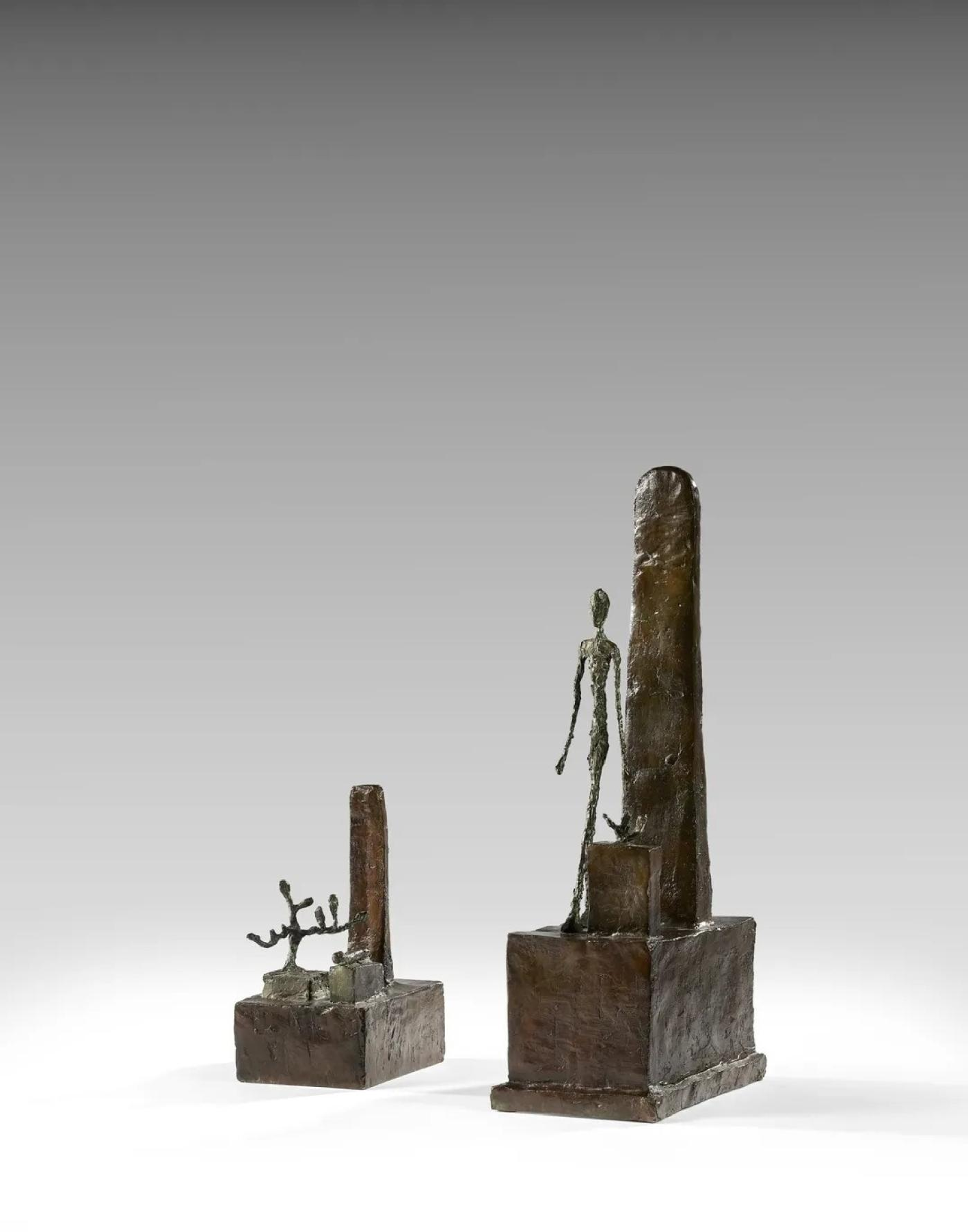 Alberto Giacometti, ensemble de deux bronzes, modèles conçus en 1946, fondus vers 1993 -1994. « Projet pour un monument à Gabriel Péri », 1946, bronze à patine brun vert, 39,10 x 10,90 x 18,60 cm, édition 1/8 ; et « Projet pour une place », 1946, bronze à patine brun vert, 18,50 x 9,30 x 12,90 cm, édition 1/8. © Artcurial/Adagp, Paris 2025