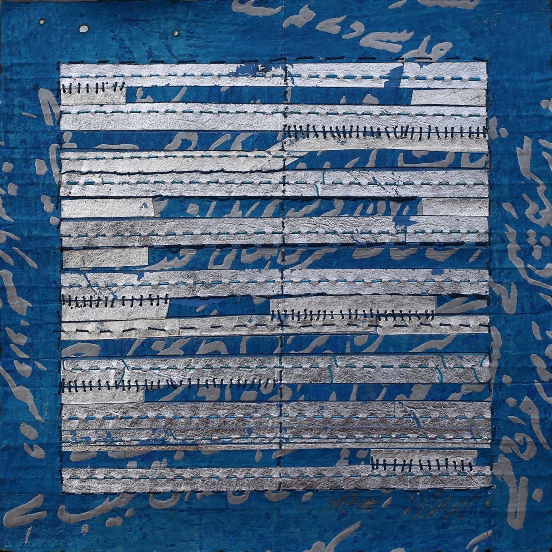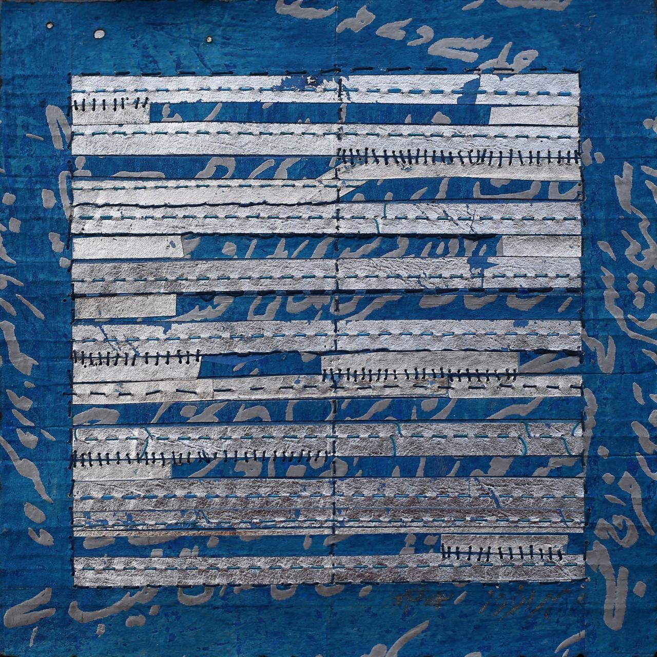 Merher Afroz, No title, 2015, acrylique, feuille d'argent, fil et papier artisanal.