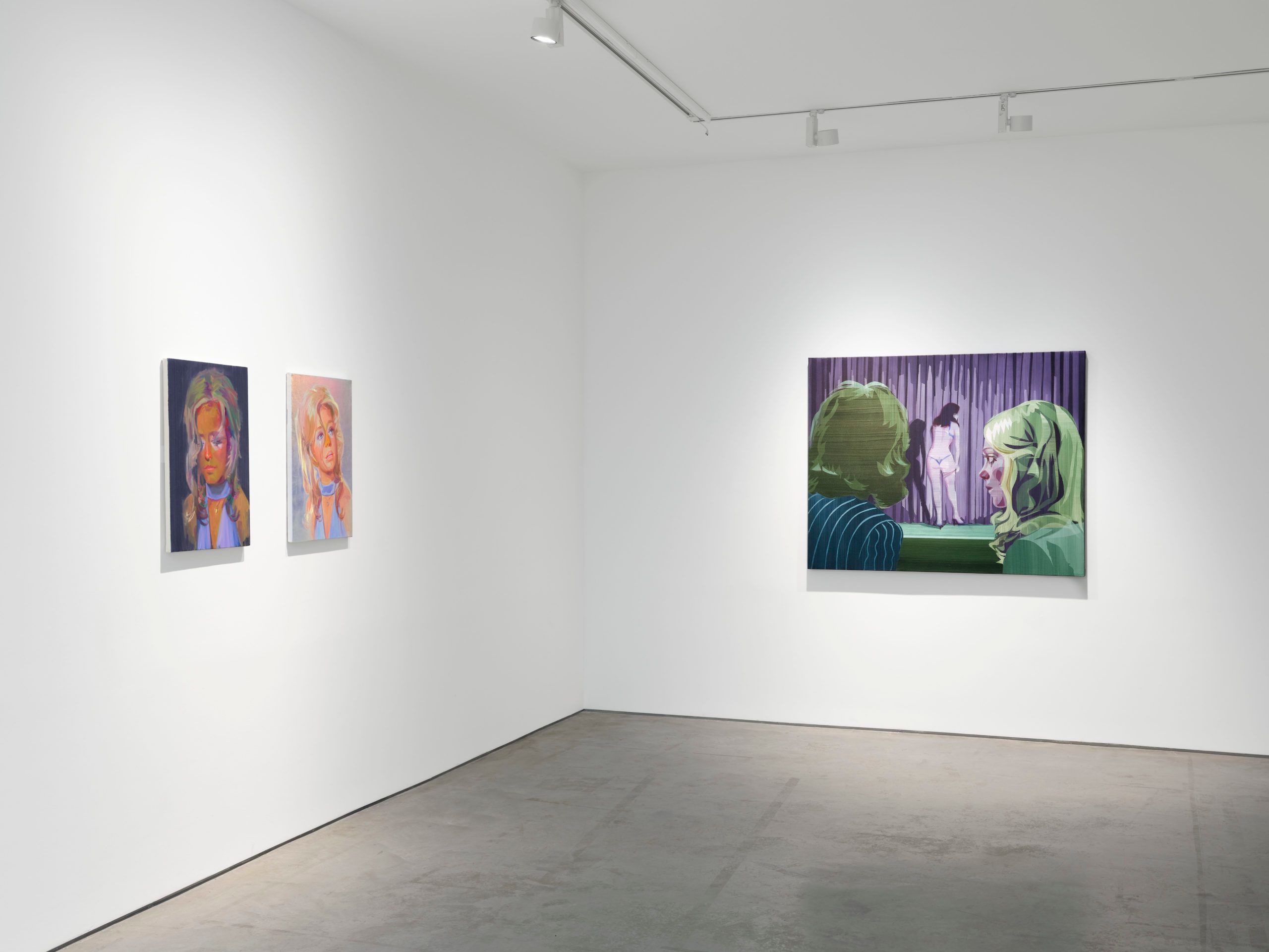Le cinéma et les variétés des années 1960 et 1970 ne font pas que fournir à Nina Childress une source inépuisable d’images ; ils inspirent l’artiste dans son travail sur la couleur et sa volonté de porter la peinture au-delà du cadre. Avec, depuis longtemps, l’emploi de peinture phosphorescente et, plus récemment, celui de couleurs caméléons employées par l’industrie, l’artiste se rapproche un peu plus de l’univers du spectacle. Le casting est l’occasion de peindre des scènes qui peuvent être le point de départ d’une histoire. On remarque une présence insistante du motif du rideau comme fond : par exemple derrière une strip-teaseuse tournant le dos à la salle ou derrière un groupe de femmes nues, vraisemblablement en attente de son lever, et qui nous tournent également le dos. C’est un double jeu sur la frustration du spectacle et une référence au rideau comme métaphore du tableau, tel qu’il peut être employé par Gerhard Richter notamment. Pour que la peinture caméléon produise tous ses effets, il a fallu que Nina Childress applique la couleur avec une large brosse qui laisse une marque régulière. Cela donne un effet artisanal qu’elle corrige par des gestes de peintre, marquant les ombres par des arêtes franches, sculptant les chevelures par quelques rehauts, fixant les traits d’un visage ou le pli d’un dos par quelques virgules noires ou une croix. L’arbitraire du peintre trouve à s’exercer avec liberté et drôlerie dans une peinture de nature réaliste, aux tons inspirés par les éclairages de scène ou de cinéma.