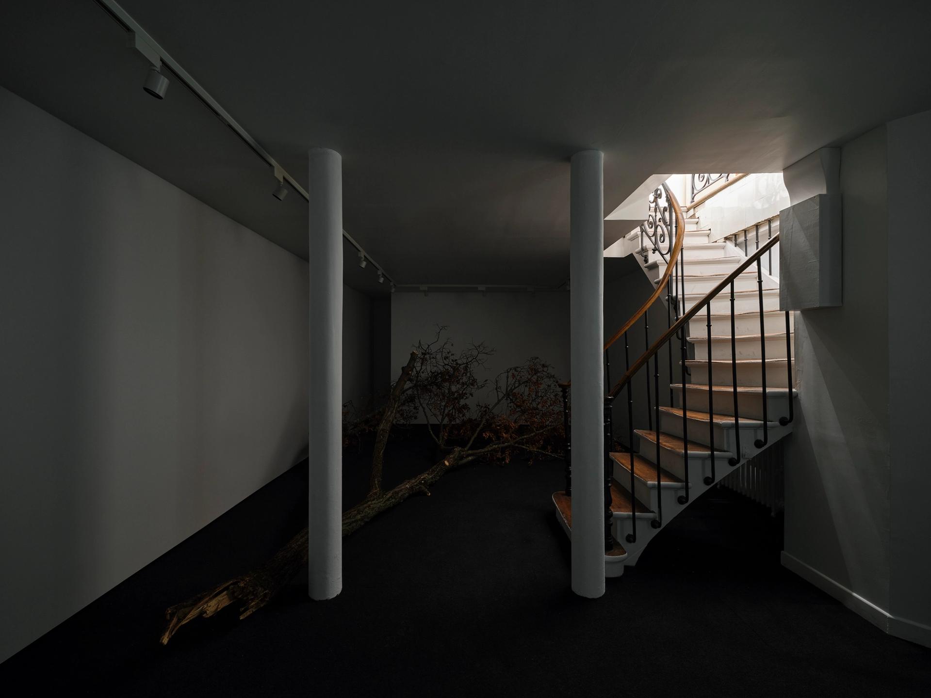 L’exposition continue au sous-sol, si le terme qui convient est bien exposition. En effet, aucune lumière n’est allumée pour offrir en spectacle la grande branche d’arbre qui, avec ses ramifications, couvre la quasi-totalité du sol. Le seul éclairage vient d’en haut et de la réserve, dont la porte, demeurée ouverte, laisse entrer une autre branche. Ces branches, arrachées par une récente tempête à un arbre du 18e arrondissement – où réside actuellement l’artiste –, qui offraient la matière d’un grand geste dans l’espace de la galerie, deviennent le cœur, à demi caché, de l’exposition. Lenard Giller nous amène à réfléchir sur le contexte et ses exactes délimitations. Curieusement, le traitement distancié de cet incident sur la voie publique procure une forme d’émotion.
