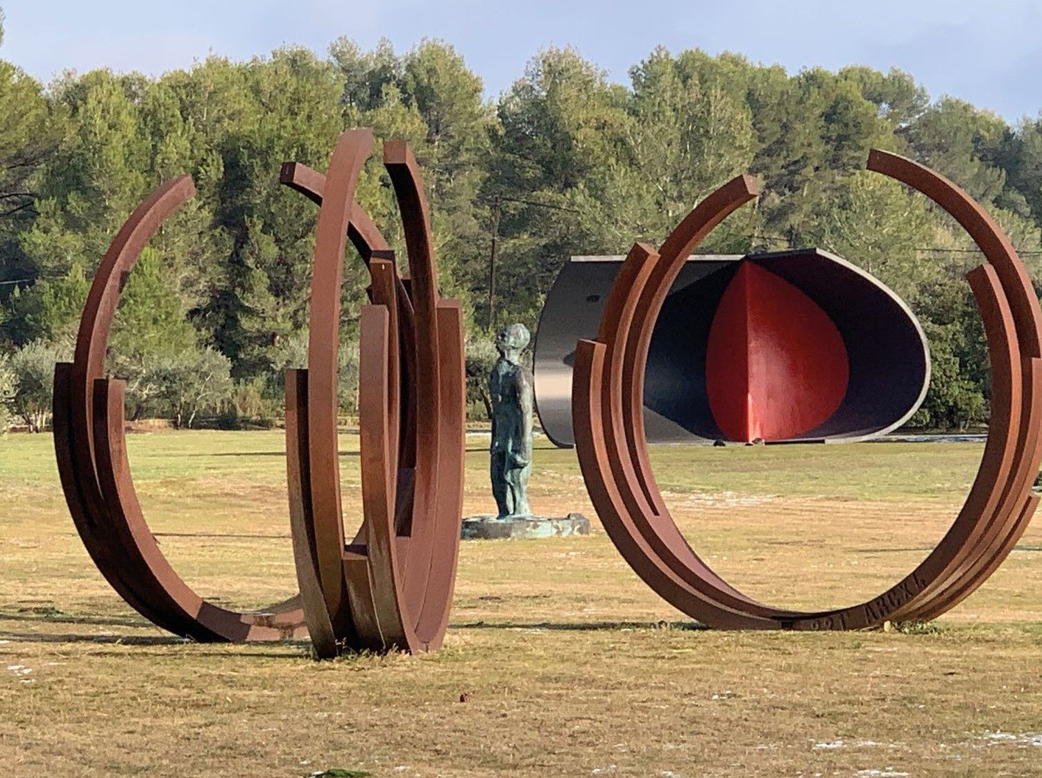 Au premier plan : Bernar Venet, Arcs, 2003 ; au centre : Thomas Schütte, Mann im Wind I, 2018 ; à l’arrière plan : Alberto Burri, Grande Ferro K, 1982.