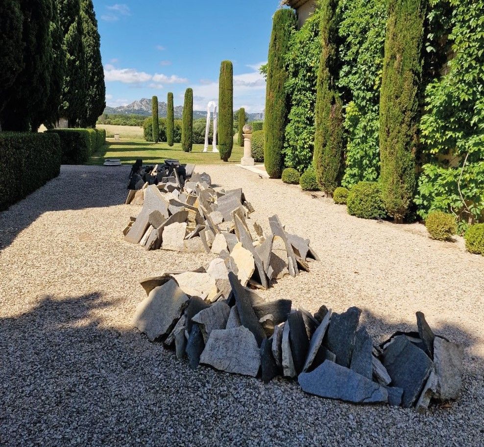Au premier plan : Richard Long, Eygalières Stone Work, 2016 ; à l’arrière plan : Erwin Wurm, Gate (Skin), 2021.