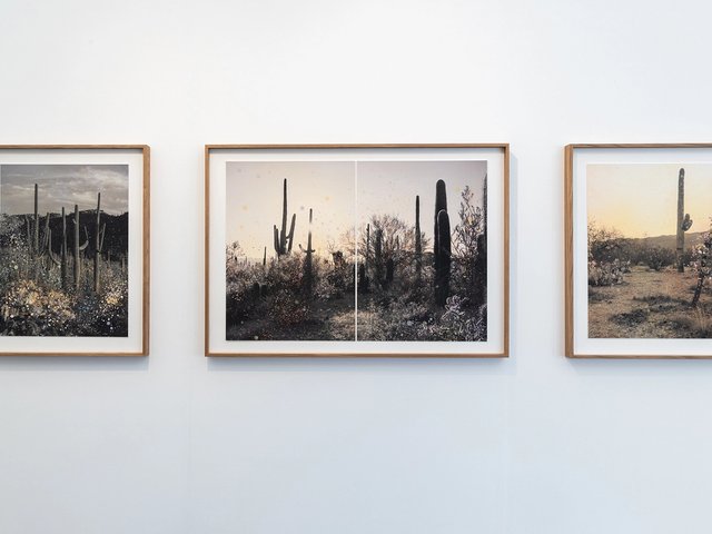Parmi les artistes internationaux, citons l’Italien Pietro Bologna (Lab 1930, Milan), lequel présente un ensemble d’images réalisées sans appareil photo (Elegìa, 2025), des pièces uniques, ou encore Julie Cockburn (Hopstreet Gallery, Bruxelles), laquelle transforme images et objets trouvés par la broderie, la sérigraphie ou la peinture (Low-hanging Fruit, 2025).