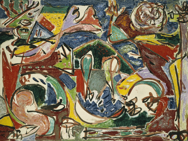 Après une première salle en forme d’hommage au maître des lieux Pablo Picasso, la section suivante introduit les années de jeunesse du peintre, formé à la Manual Arts High School puis à l’Otis College of Art and Design, à Los Angeles. Marqué par Fernand Léger, Giorgio de Chirico et, bien sûr, Pablo Picasso autant que par Paolo Uccello et Piero della Francesca, Philip Guston s’intéresse d’abord à la peinture murale et à son essence politique. Il peint au John Reed Club, cercle marxiste qu’il fréquente, un premier décor, The Scottsboro Case (vers 1931), dénonciation des exactions racistes commises par le KKK en Alabama. Peu après, il fait la connaissance des muralistes mexicains José Clemente Orozco et David Alfaro Siqueiros, venus réaliser des fresques monumentales à Los Angeles. Ce dernier obtient pour Philip Guston et son camarade Reuben Kadish la commande d’un mural à Mexico, The Struggle against Terrorism (1935). Ce sera ensuite la Works Progress Administration de Franklin D. Roosevelt qui lui commandera des peintures murales. Sur les cimaises sont accrochées plusieurs études pour ces décors (Study for « Work and Play », 1939).