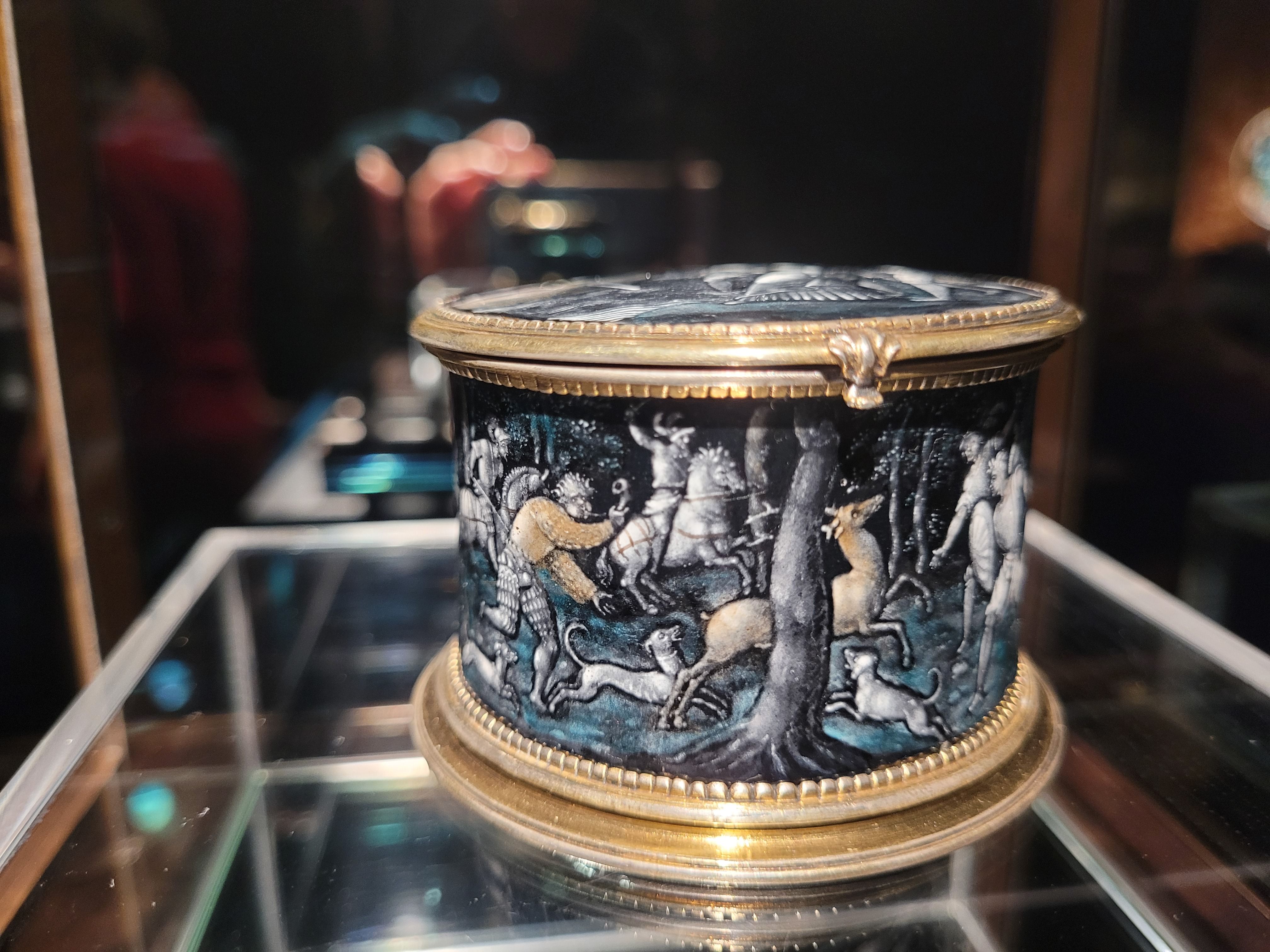Maître MP, boîte cylindrique montée en argent doré, vers 1540, galerie Kugel. Photo : Guillaume Benoit