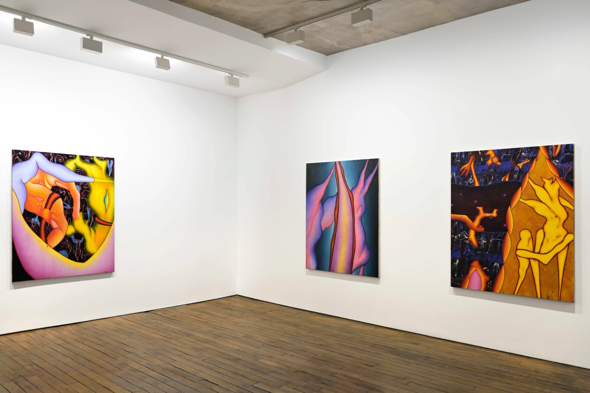 On aurait peine à nommer le tableau le plus déchaîné, mais Hooked fait un bon candidat, et celui qui se rapproche peut-être le plus de la danse. On y voit, au premier plan, trois formes rose chair dans lesquelles semble fusionner une fesse, une jambe et un bras ; trois formes marquées de scarifications rouges qui partent du bord inférieur de la toile et qui, pour deux d’entre elles, s’élèvent jusqu’au bord supérieur, comme s’il leur fallait le porter. Dans cette sorte de mandorle qu’elles dessinent apparaît au loin un homuncule aux bras tendus qui se dresse sur un halo jaune et vert. De chaque côté de cette architecture de chair, s’amassent des formes sinueuses, voire torsadées et qui semblent contenues dans un espace dont les parois sont couvertes de centaines de taches de couleurs.