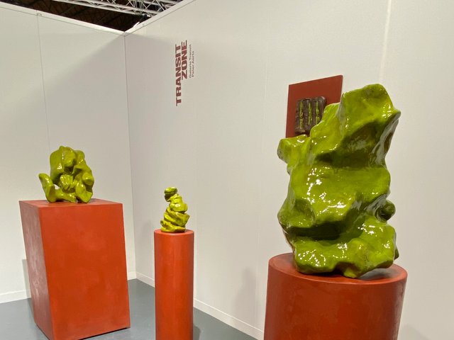 Les visiteurs sont ainsi accueillis par un spectaculaire ensemble du sculpteur Elmar Trenkwalder. Cette allégorie des cinq sens – longue de 7 mètres et haute de 3 mètres – s’inscrit dans une démarche combinant architecture et accumulation, ornementation et coloration, figuration et abstraction. Il en résulte des structures complexes dont les références plongent dans l’histoire de l’art tant occidentale qu’orientale. L’artiste autrichien bénéficie par ailleurs d’un solo show tout aussi conséquent sur le stand de la Galerie Bernard Jordan (Paris).