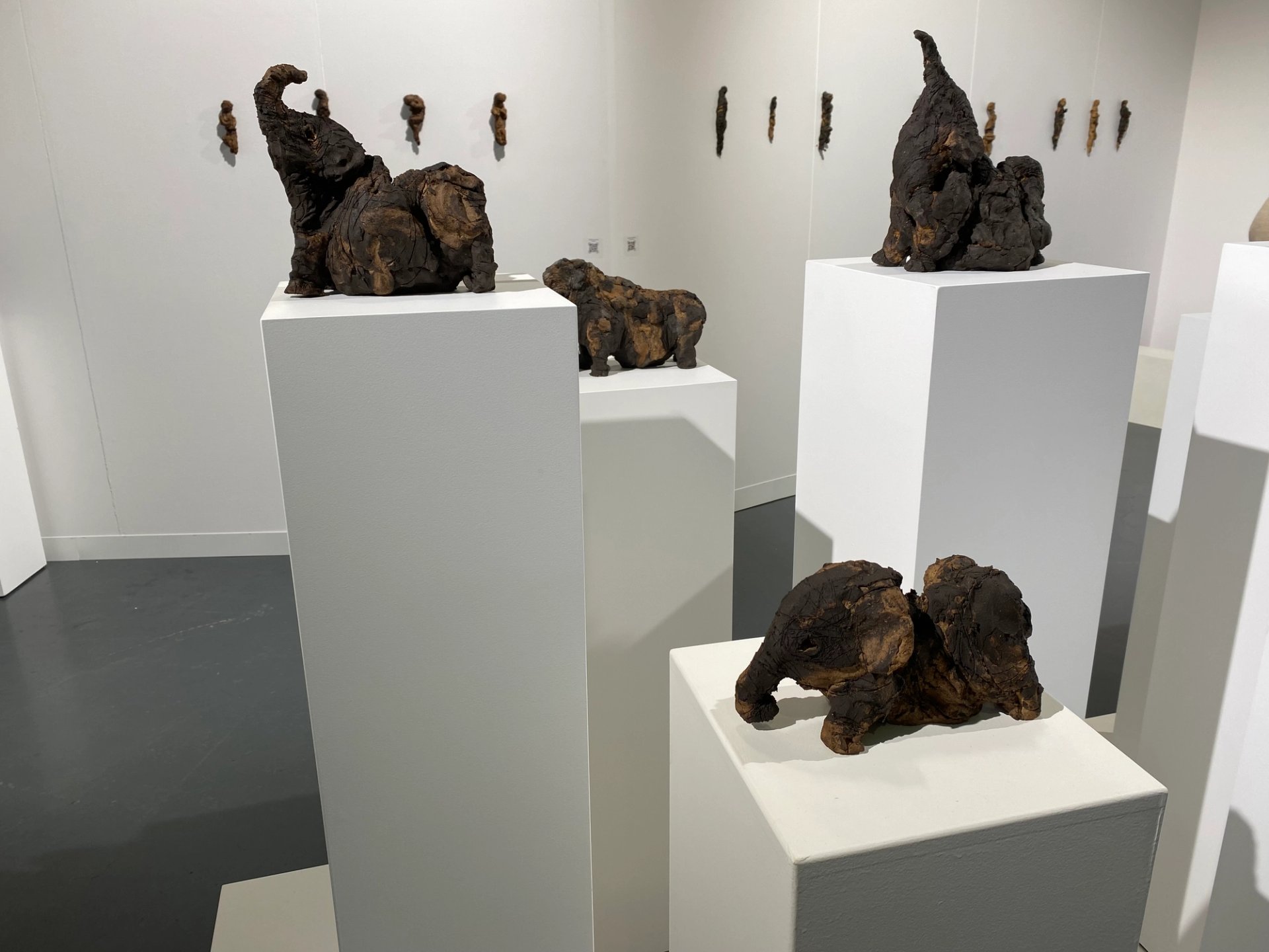Autre duo inattendu, mais réussi, celui que la Galerie Laurentin (Bruxelles et Paris) propose entre deux artistes de générations différentes : l’un est membres historiques de CoBrA, le sculpteur belge Reinhoud (1928-2007), avec ses figures animalières (de 3 500 à 12 000 euros) ; l’autre est le Français Lionel Sabatté. Ce dernier s’est lancé tout récemment, et avec bonheur, dans la céramique avec une dizaine de petites silhouettes pachydermiques appelées « Les Mouthes » (à 7 500 euros).